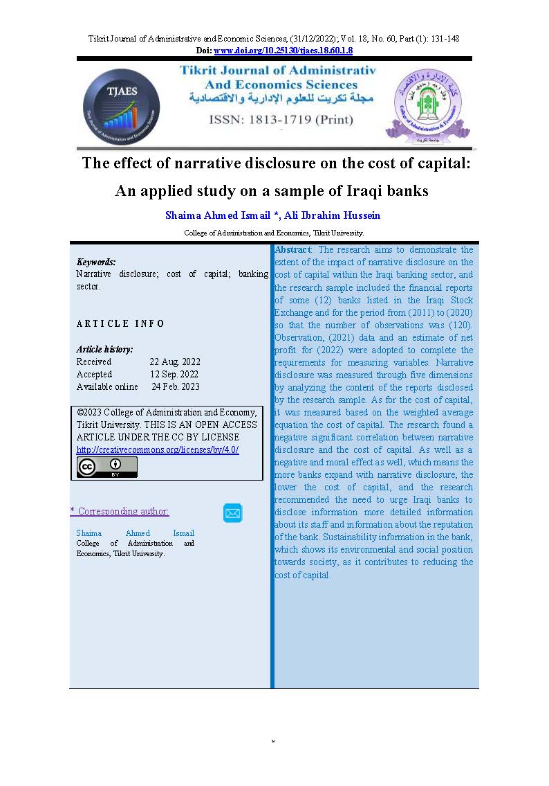 The effect of narrative disclosure on the cost of capital: An applied study on a sample of Iraqi banks