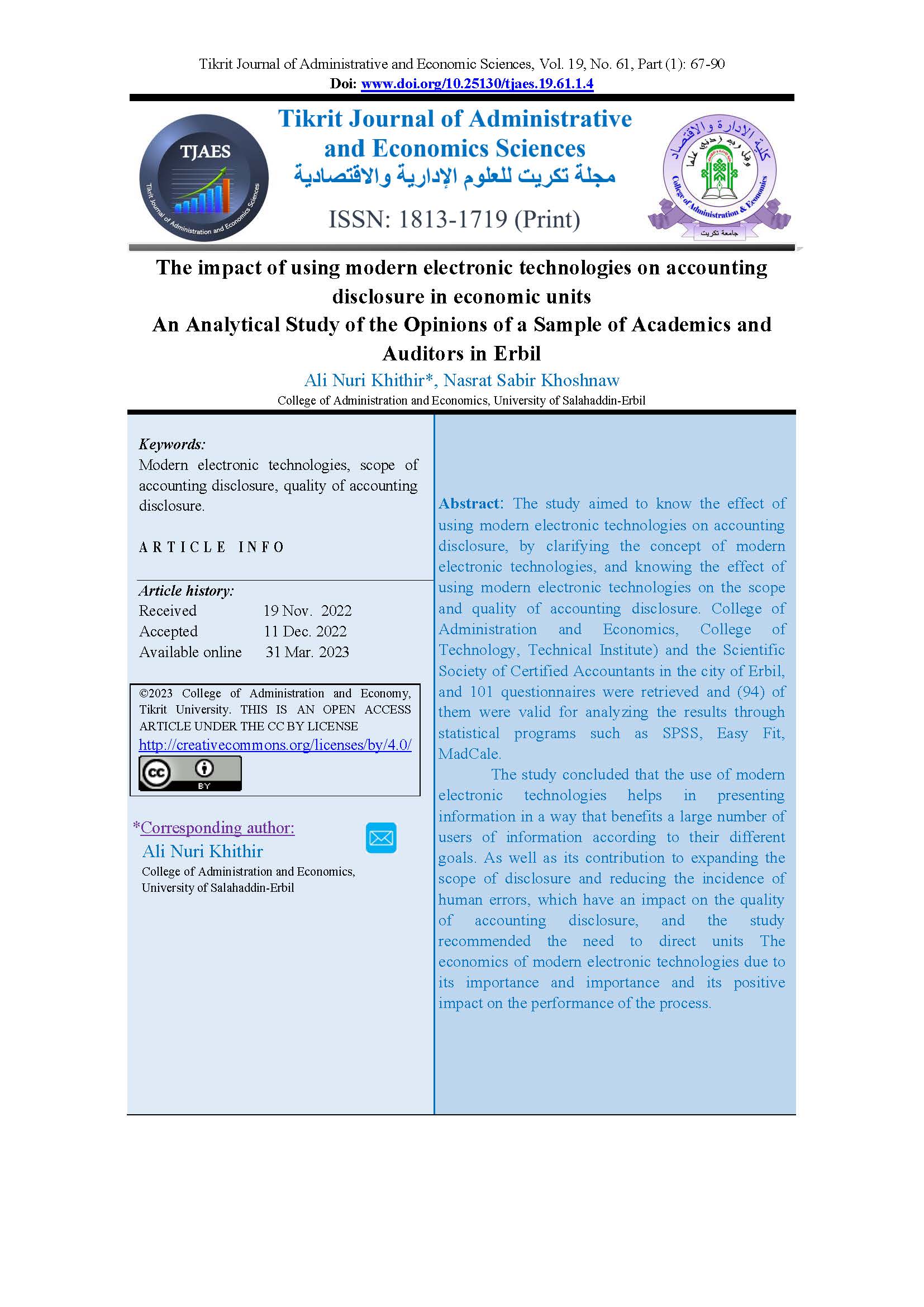 The impact of using modern electronic technologies on accounting disclosure in economic units An Analytical Study of the Opinions of a Sample of Academics and Auditors in Erbil