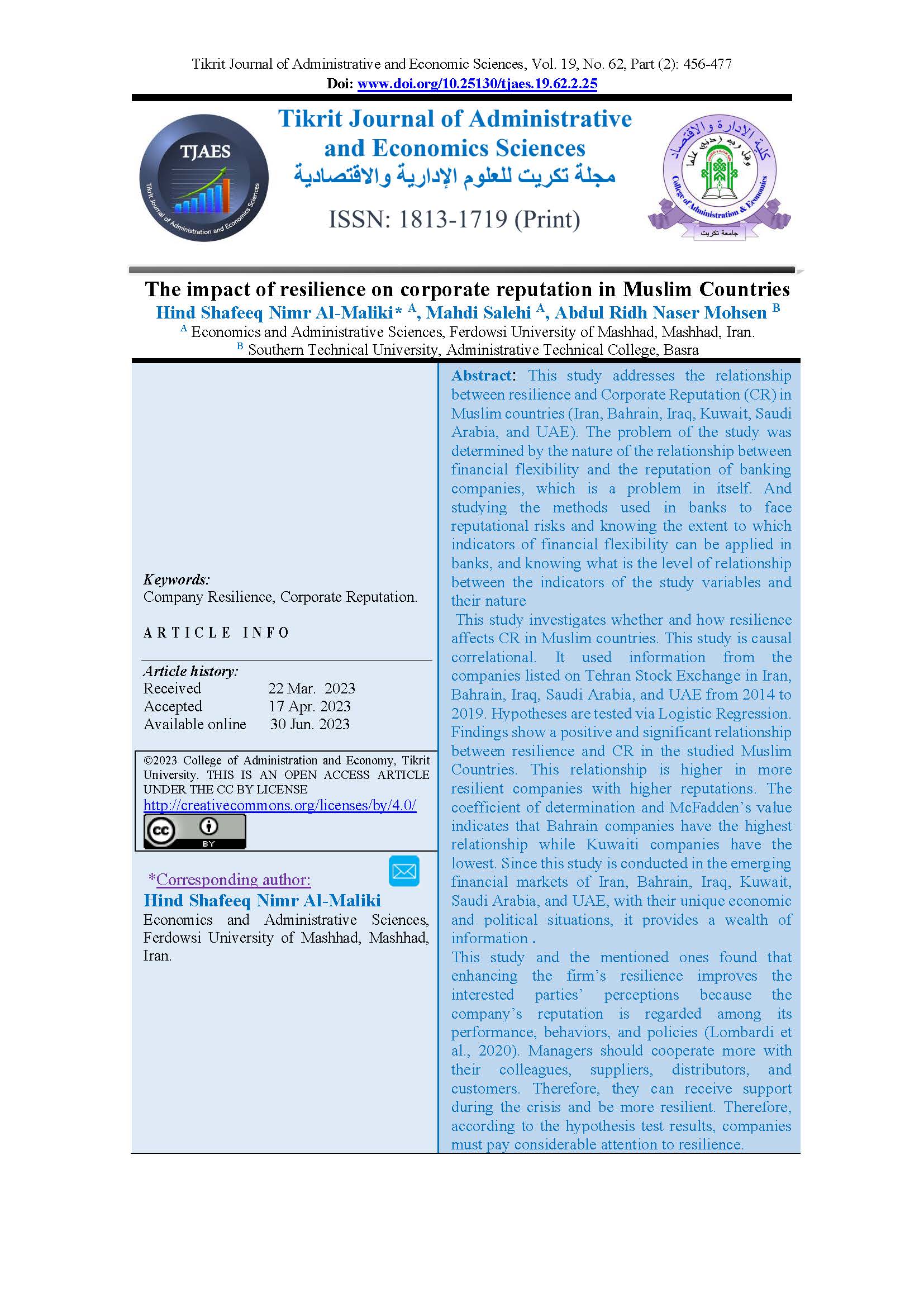 The impact of resilience on corporate reputation in Muslim Countries