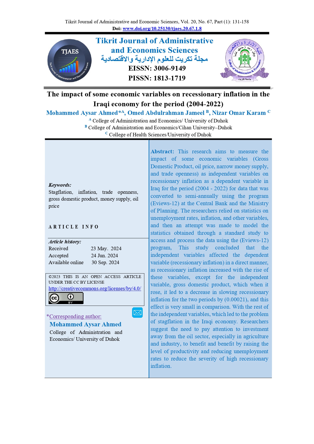 أثر بعض المتغيرات الاقتصادية على التضخم الركودي في الاقتصاد العراقي للمدة (2004-2022)