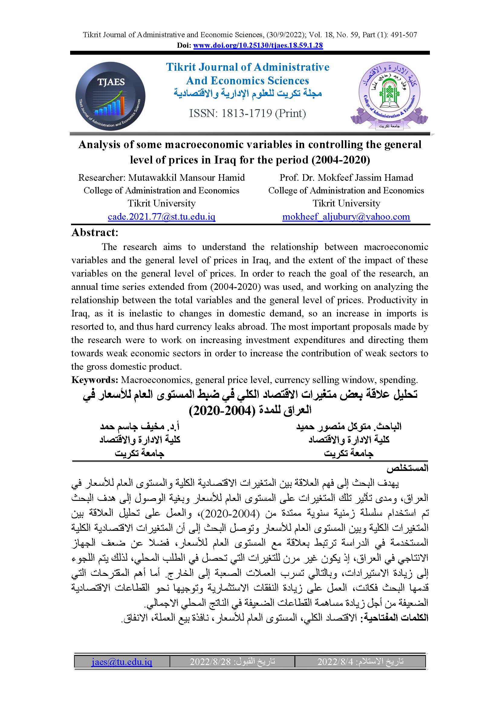 Analysis of some macroeconomic variables in controlling the general level of prices in Iraq for the period (2004-2020)Abstract views : 19 | PDF downloads : 80Page No.: 491-507 |