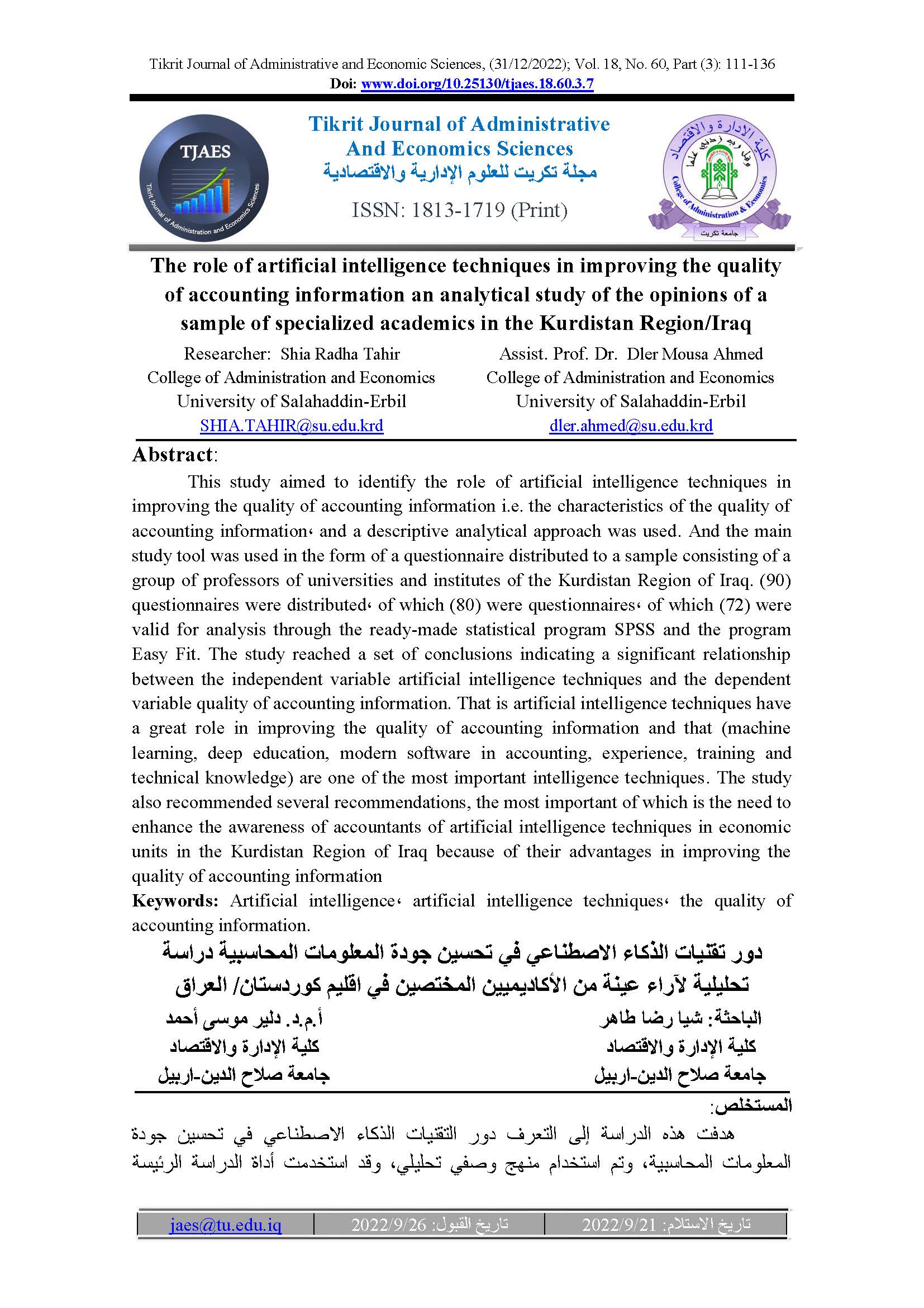 The role of artificial intelligence techniques in improving the quality of accounting information an analytical study of the opinions of a sample of specialized academics in the Kurdistan Region/IraqAbstract views : 0 | PDF downloads : 0Page No.: 111-136 |