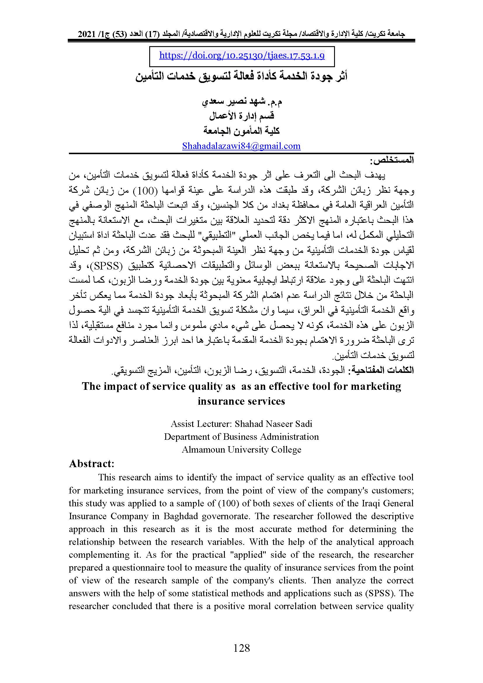 The impact of service quality as as an effective tool for marketing insurance servicesAbstract views : 0 | PDF downloads : 0Page No.: 128-141 |