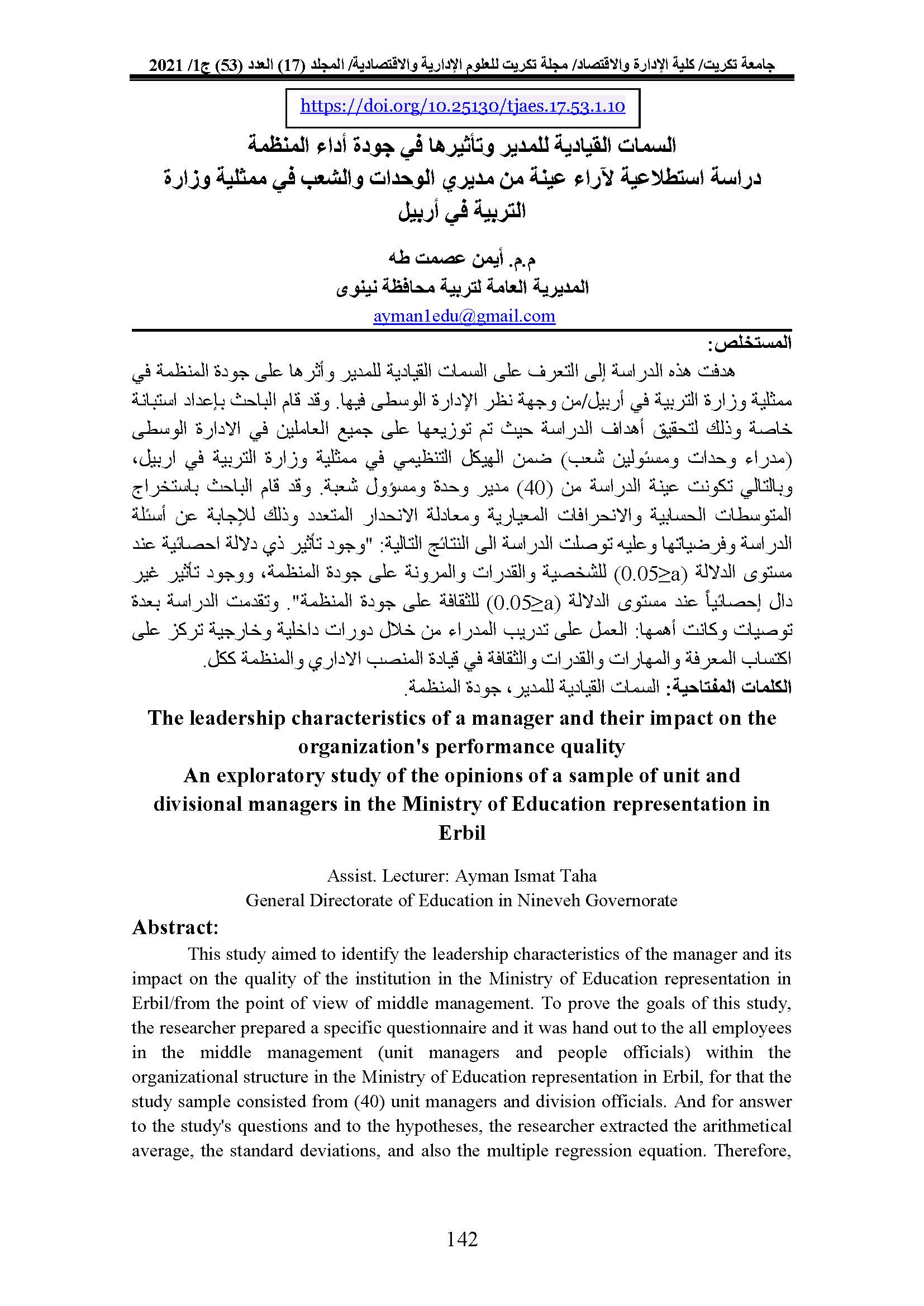 Role of the (WICS) Model of Leadership in the Organizational Decision Making Process An Analytical Study of the Views of a Sample of Leaders and Employees of the Salah El-Din Electricity Distribution DepartmentAbstract views : 0 | PDF downloads : 0Page No.: 263-279 |