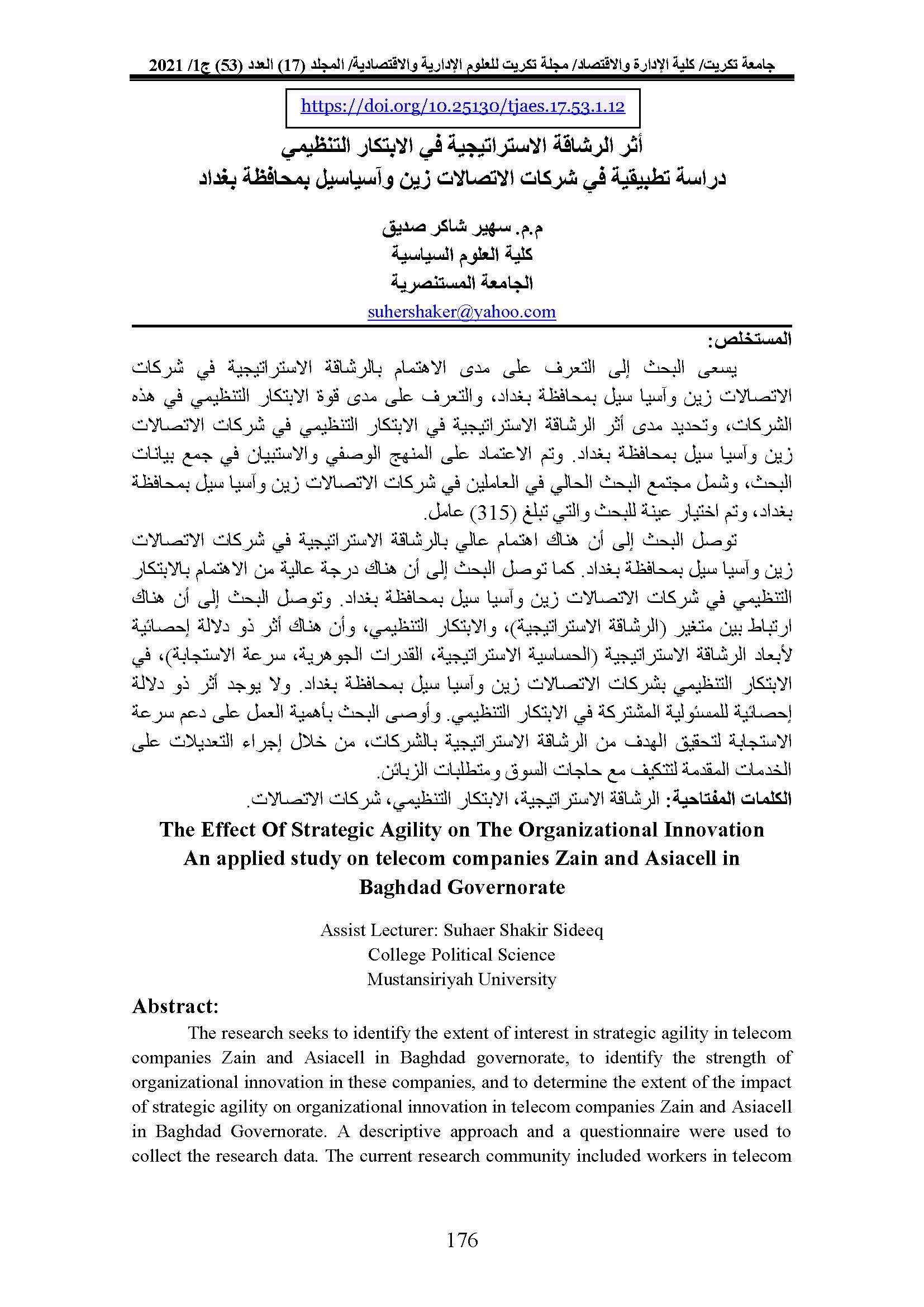 The Effect Of Strategic Agility on The Organizational Innovation An applied study on telecom companies Zain and Asiacell in Baghdad GovernorateAbstract views : 0 | PDF downloads : 0Page No.: 176-195 |