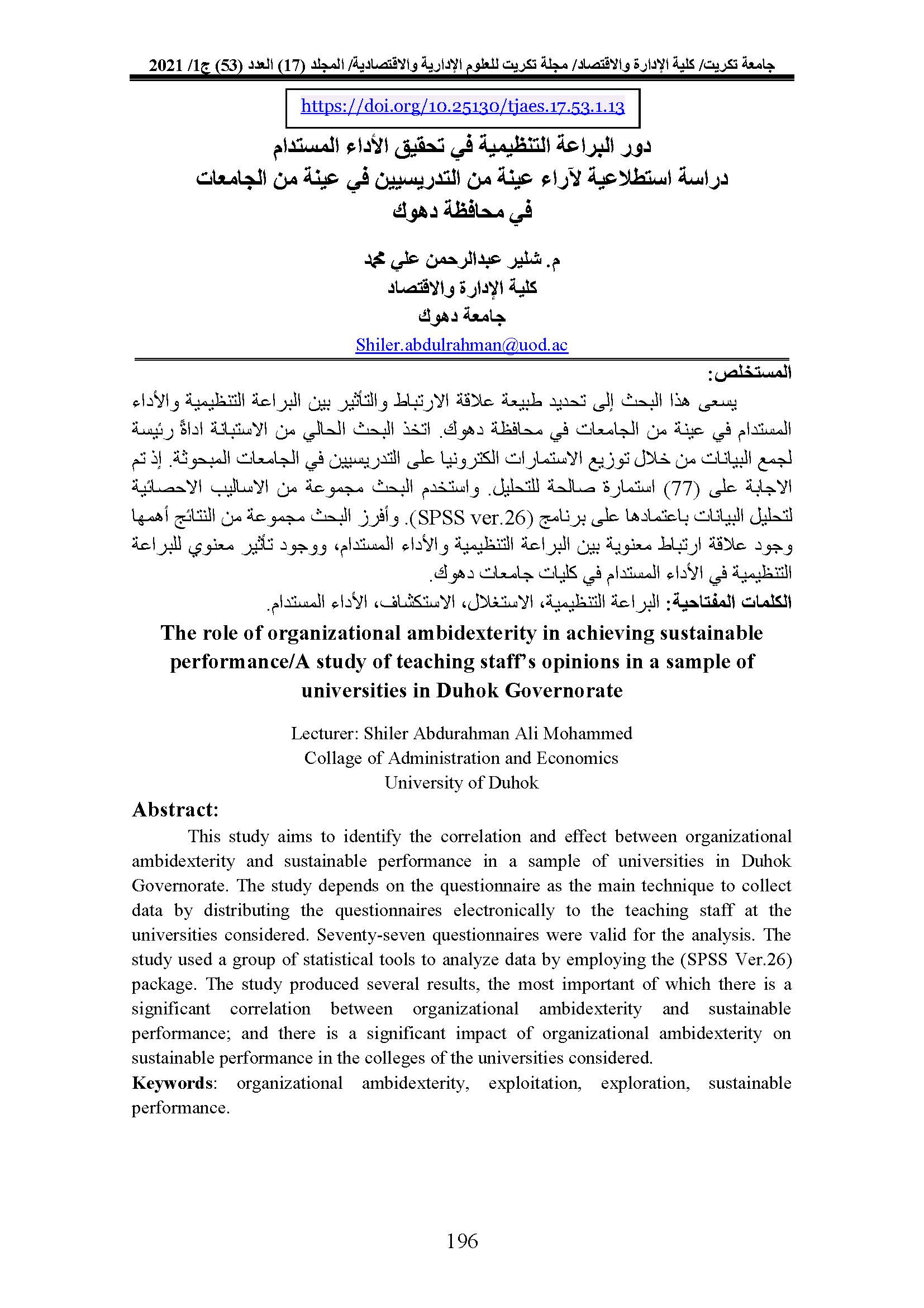 The role of organizational ambidexterity in achieving sustainable performance/A study of teaching staff’s opinions in a sample of universities in Duhok GovernorateAbstract views : 0 | PDF downloads : 0Page No.: 196-215 |
