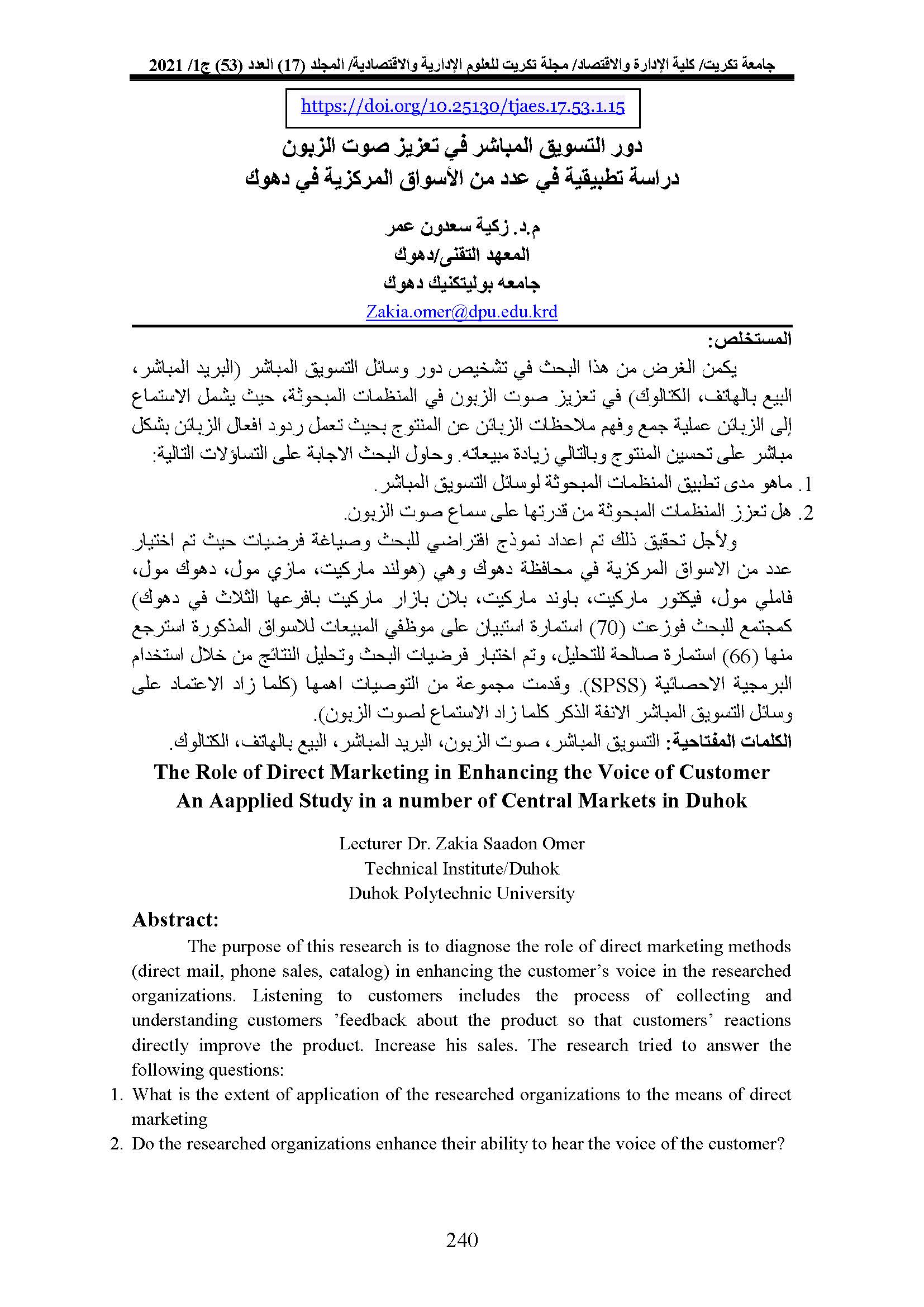 The Role of Direct Marketing in Enhancing the Voice of Customer An Aapplied Study in a number of Central Markets in DuhokAbstract views : 0 | PDF downloads : 0Page No.: 240-262 |