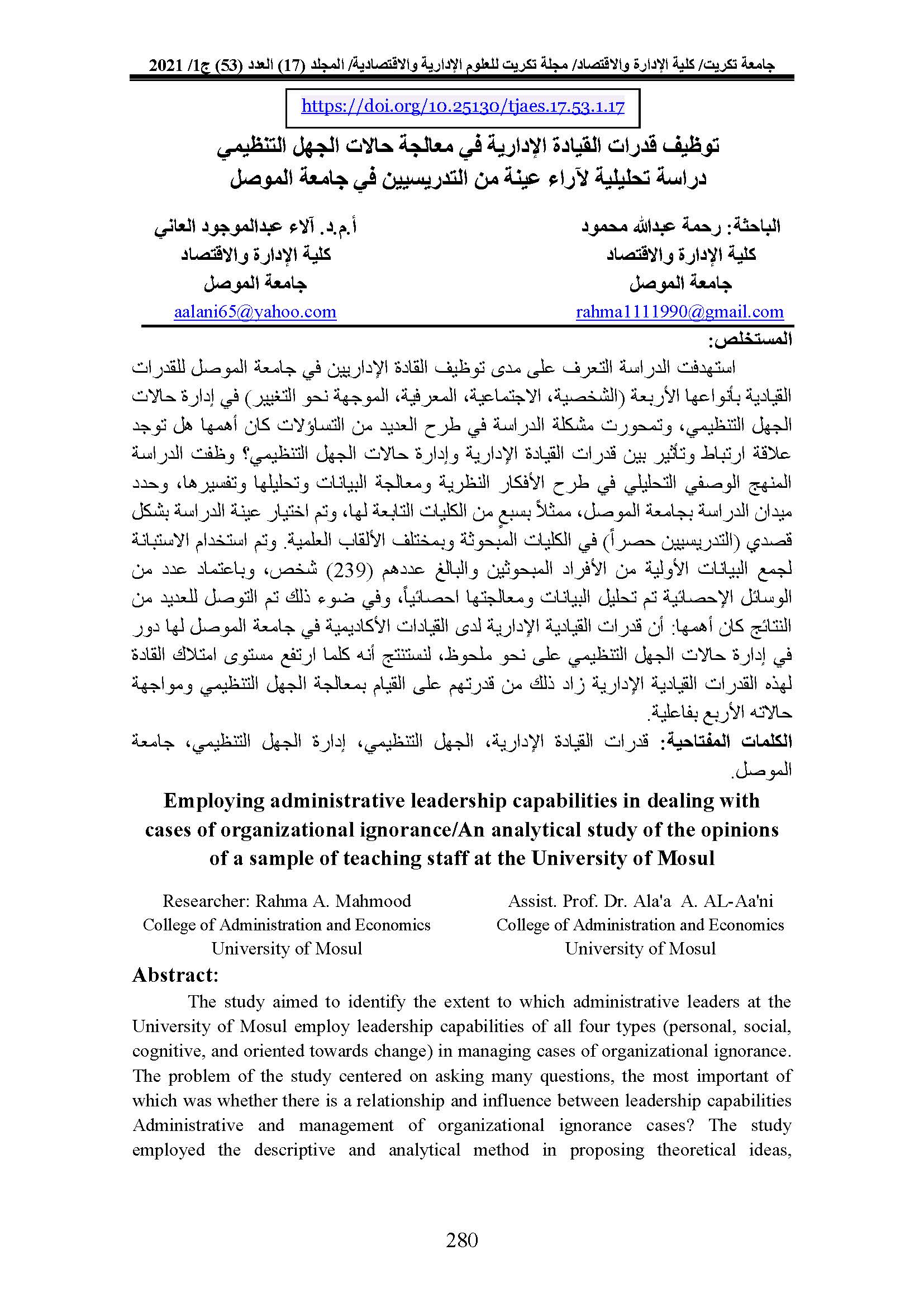Employing administrative leadership capabilities in dealing with cases of organizational ignorance/An analytical study of the opinions of a sample of teaching staff at the University of MosulAbstract views : 0 | PDF downloads : 0Page No.: 280-300 |