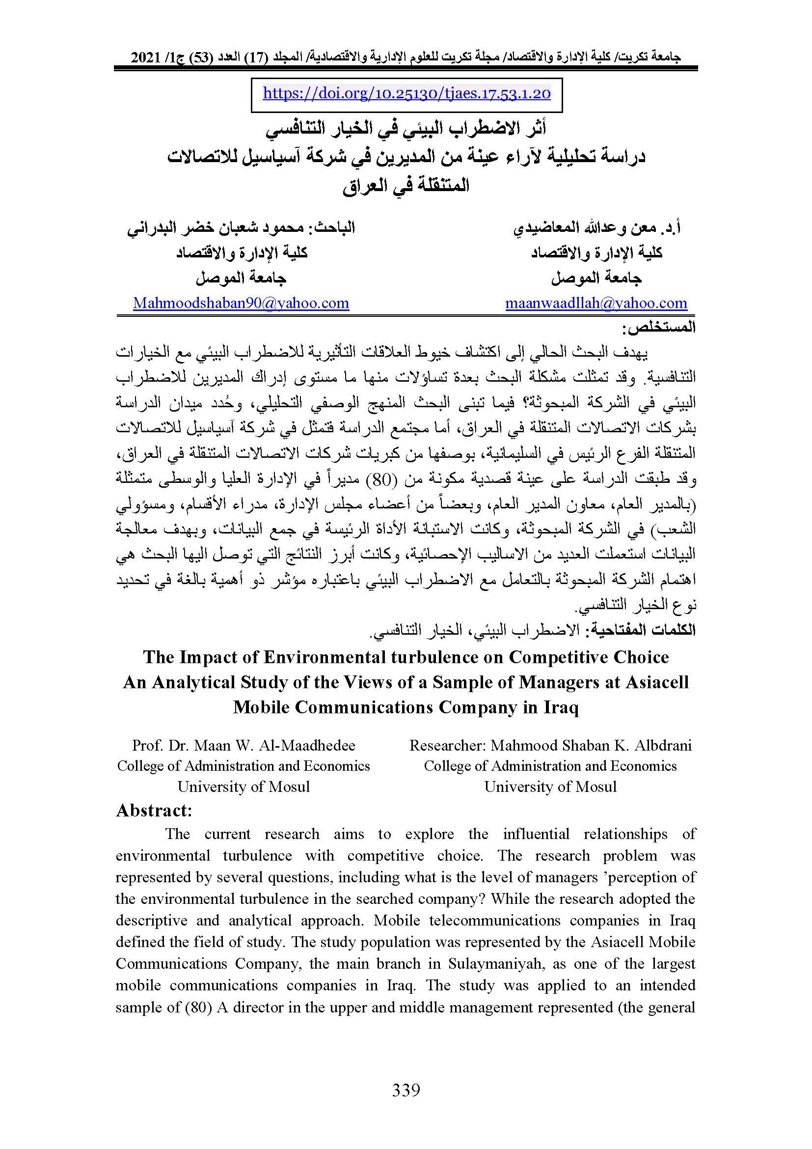 The Impact of Environmental turbulence on Competitive Choice An Analytical Study of the Views of a Sample of Managers at Asiacell Mobile Communications Company in IraqAbstract views : 0 | PDF downloads : 0Page No.: 339-361 |