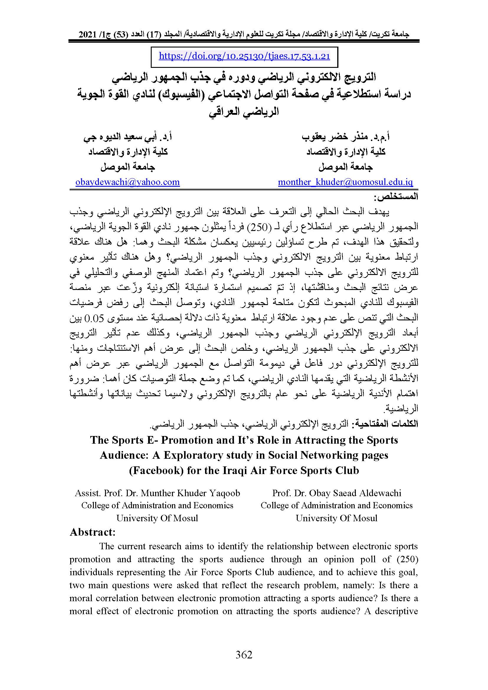 The Sports E- Promotion and It’s Role in Attracting the Sports Audience: A Exploratory study in Social Networking pages (Facebook) for the Iraqi Air Force Sports ClubAbstract views : 0 | PDF downloads : 0Page No.: 362-376 |