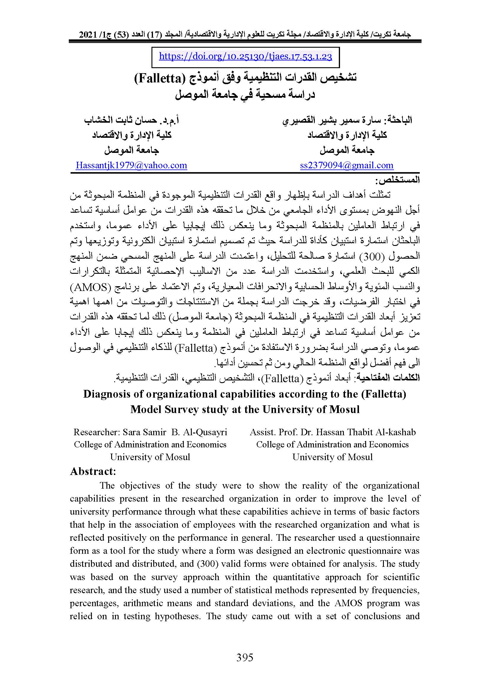 Diagnosis of organizational capabilities according to the (Falletta) Model Survey study at the University of MosulAbstract views : 0 | PDF downloads : 0Page No.: 395-414 |