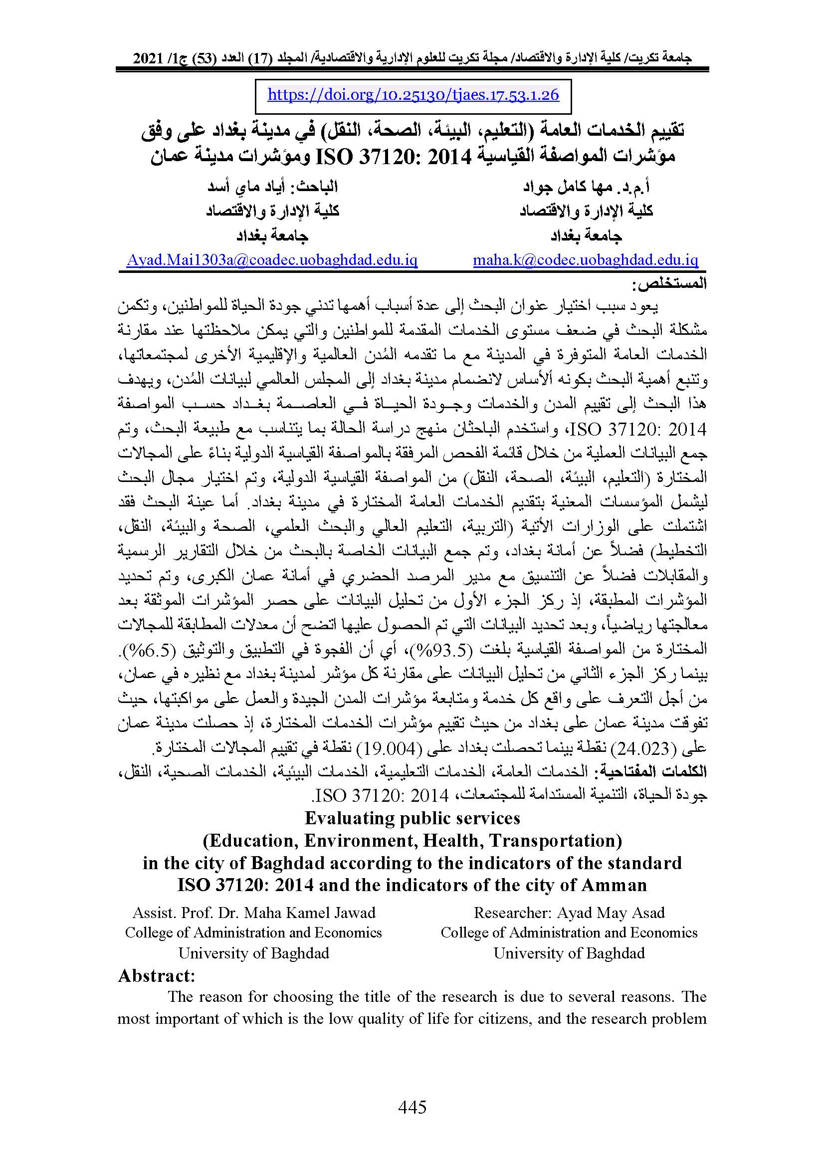 Evaluating public services (Education, Environment, Health, Transportation) in the city of Baghdad according to the indicators of the standard ISO 37120: 2014 and the indicators of the city of AmmanAbstract views : 0 | PDF downloads : 0Page No.: 445-467 |