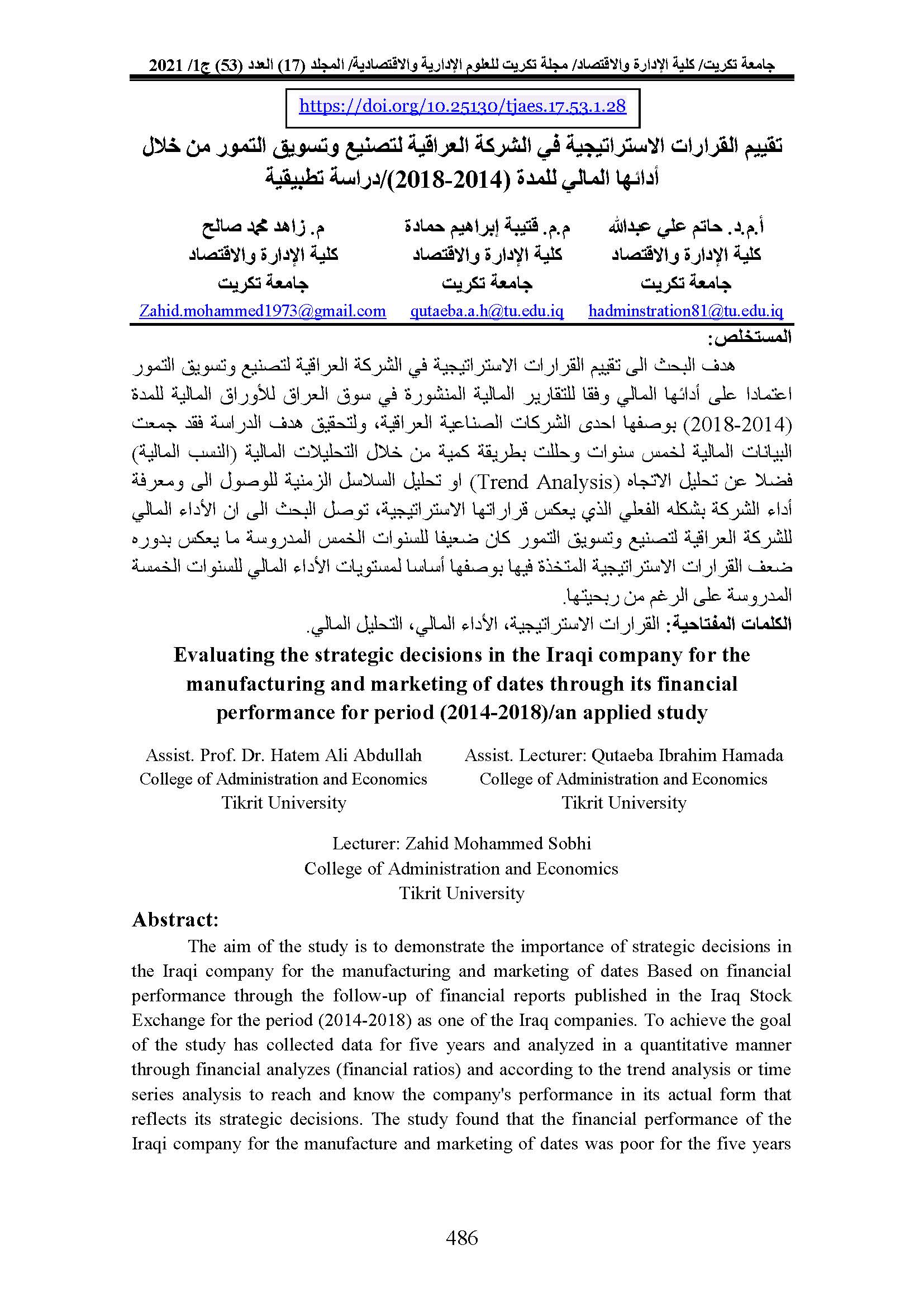 Evaluating the strategic decisions in the Iraqi company for the manufacturing and marketing of dates through its financial performance for period (2014-2018)/an applied studyAbstract views : 0 | PDF downloads : 0Page No.: 486-496 |