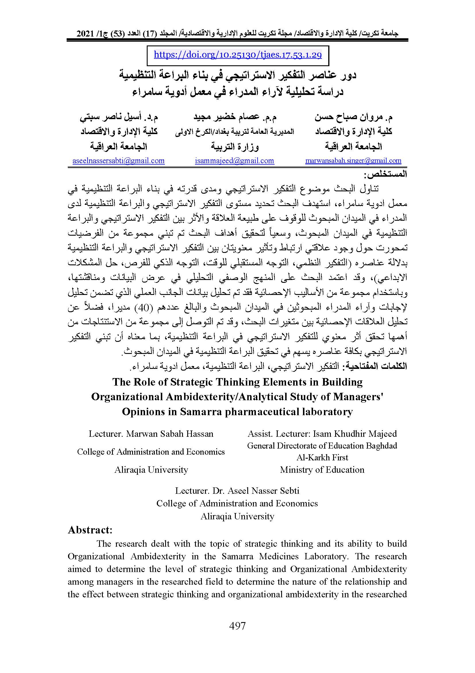 The Role of Strategic Thinking Elements in Building Organizational Ambidexterity/Analytical Study of Managers' Opinions in Samarra pharmaceutical laboratoryAbstract views : 0 | PDF downloads : 0Page No.: 497-514 |