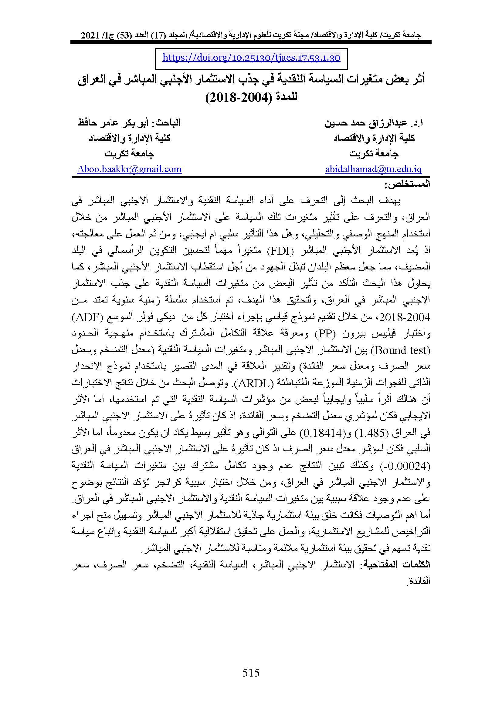 The effect of some monetary policy variables in attracting foreign direct investment in Iraq for the period (2004-2018)Abstract views : 0 | PDF downloads : 0Page No.: 515-531 |