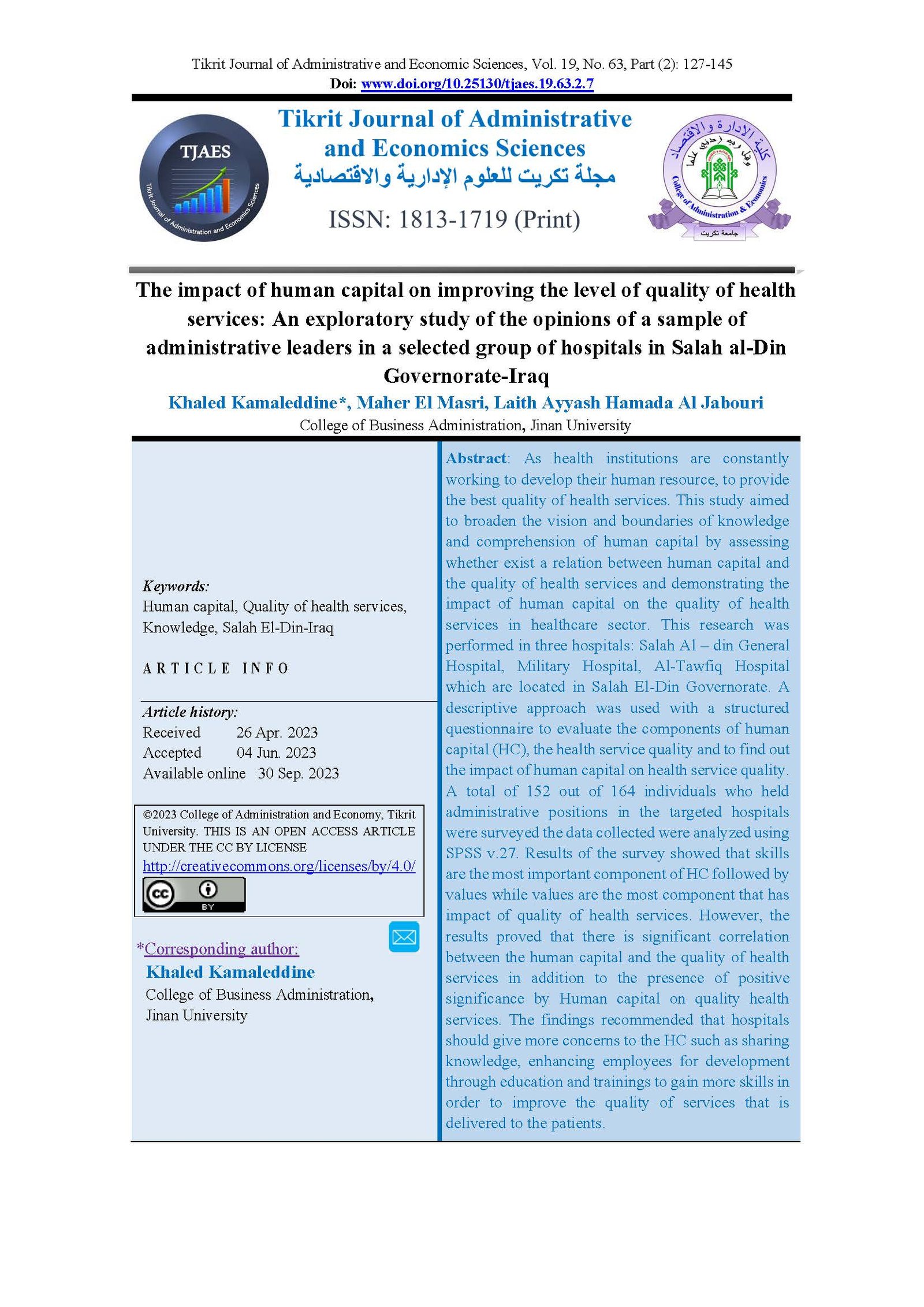 The impact of human capital on improving the level of quality of health services: An exploratory study of the opinions of a sample of administrative leaders in a selected group of hospitals in Salah al-Din Governorate-Iraq