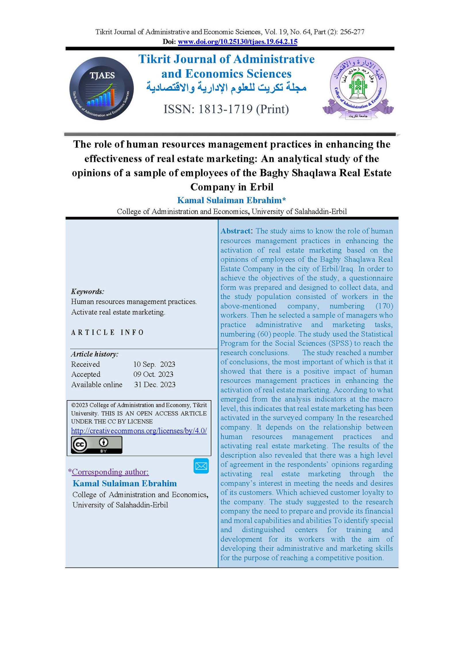 دور ممارسات إدارة الموارد البشرية في تعزيز فاعلية التسويق العقاري دراسة تحليلية لآراء عينة من العاملين في شركة عقارات باغي شقلاوة في أربيل