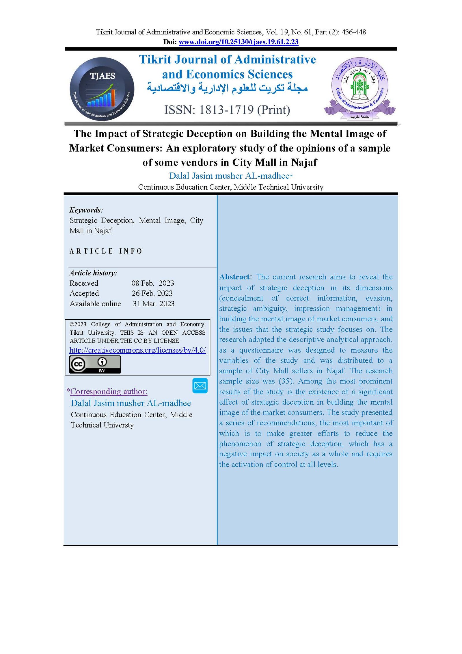 The Impact of Strategic Deception on Building the Mental Image of Market Consumers: An exploratory study of the opinions of a sample of some vendors in City Mall in Najaf