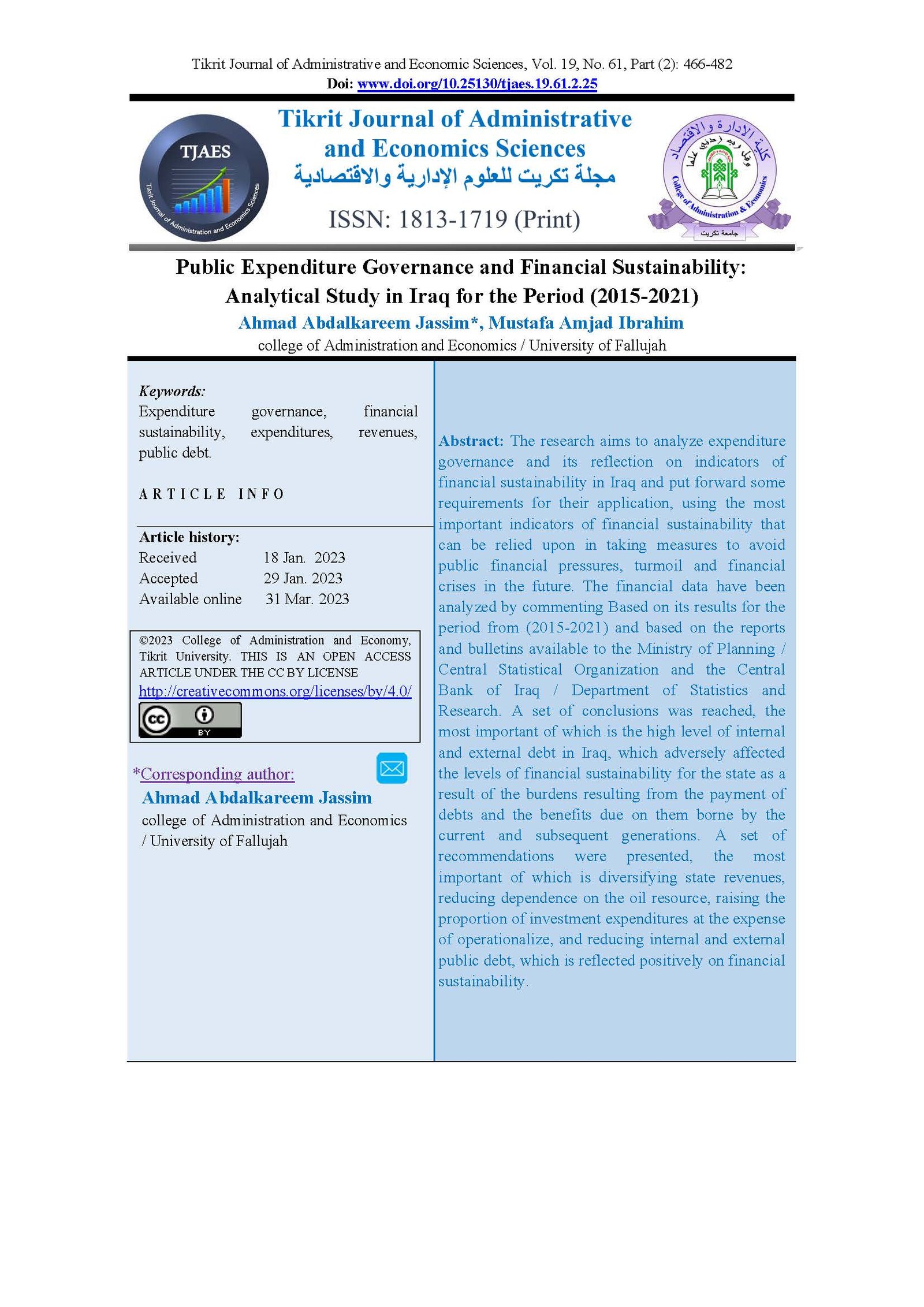 Public Expenditure Governance and Financial Sustainability: Analytical Study in Iraq for the Period (2015-2021)