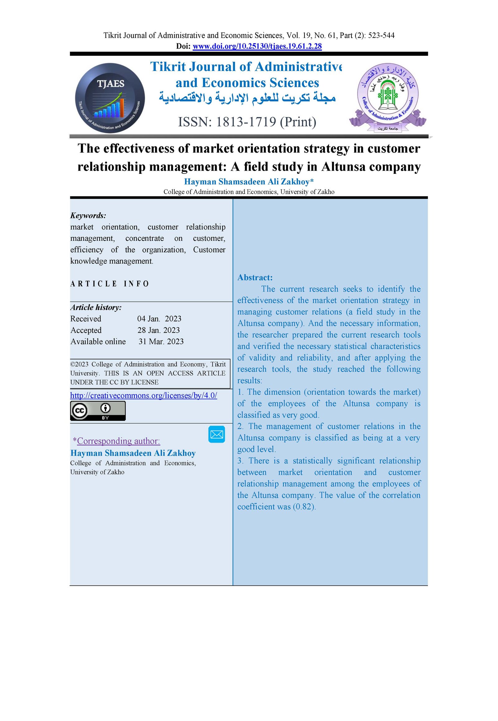 The current research seeks to identify the effectiveness of the market orientation strategy in managing customer relations (a field study in the Altunsa company). And the necessary information, the researcher prepared the current research tools and verified the necessary statistical characteristics of validity and reliability, and after applying the research tools, the study reached the following results: