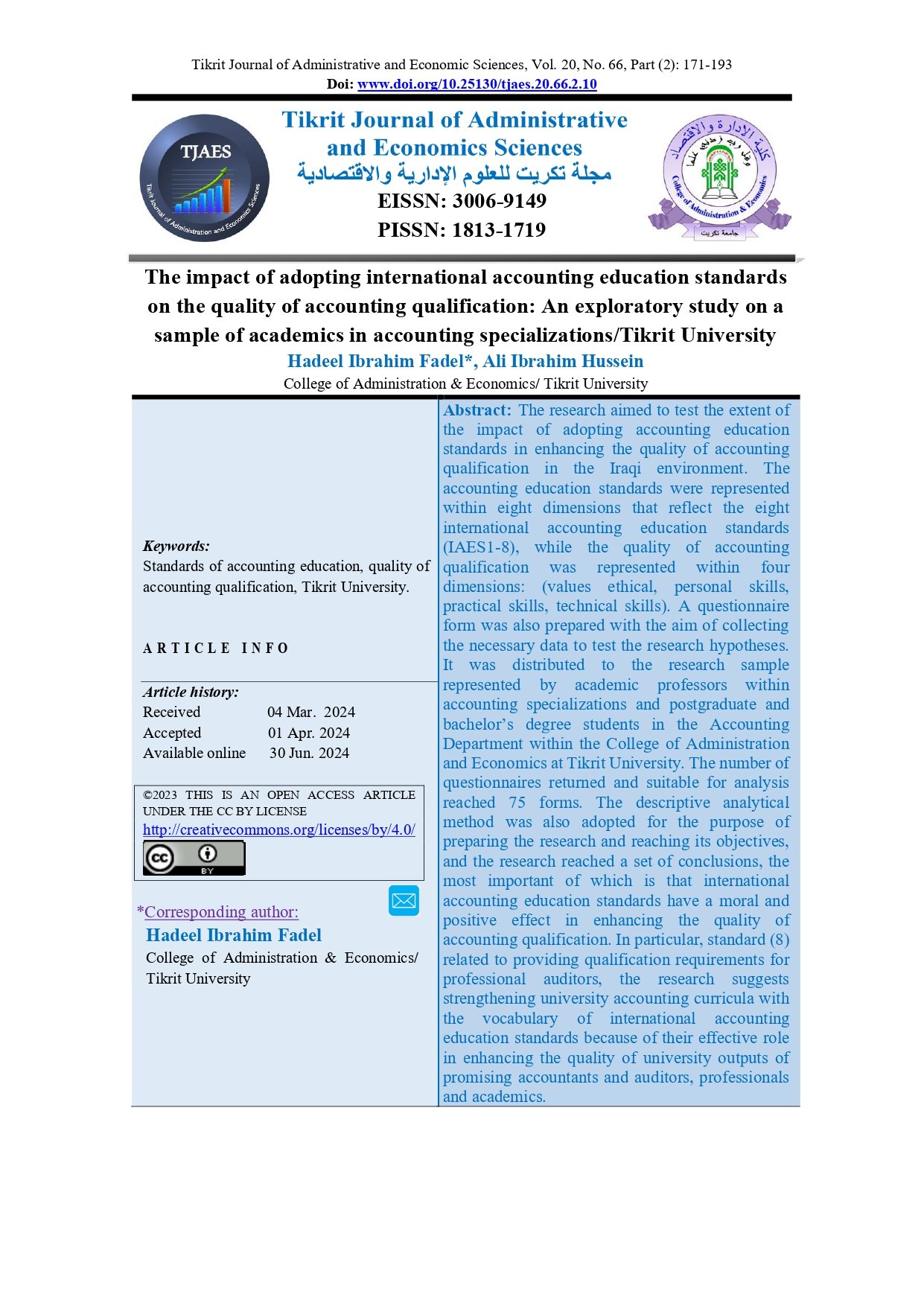 أثر تبني معايير التعليم المحاسبي الدولية في جودة التأهيل المحاسبي: دراسة استطلاعية على عينة من الأكاديميين في التخصصات المحاسبية/ جامعة تكريت