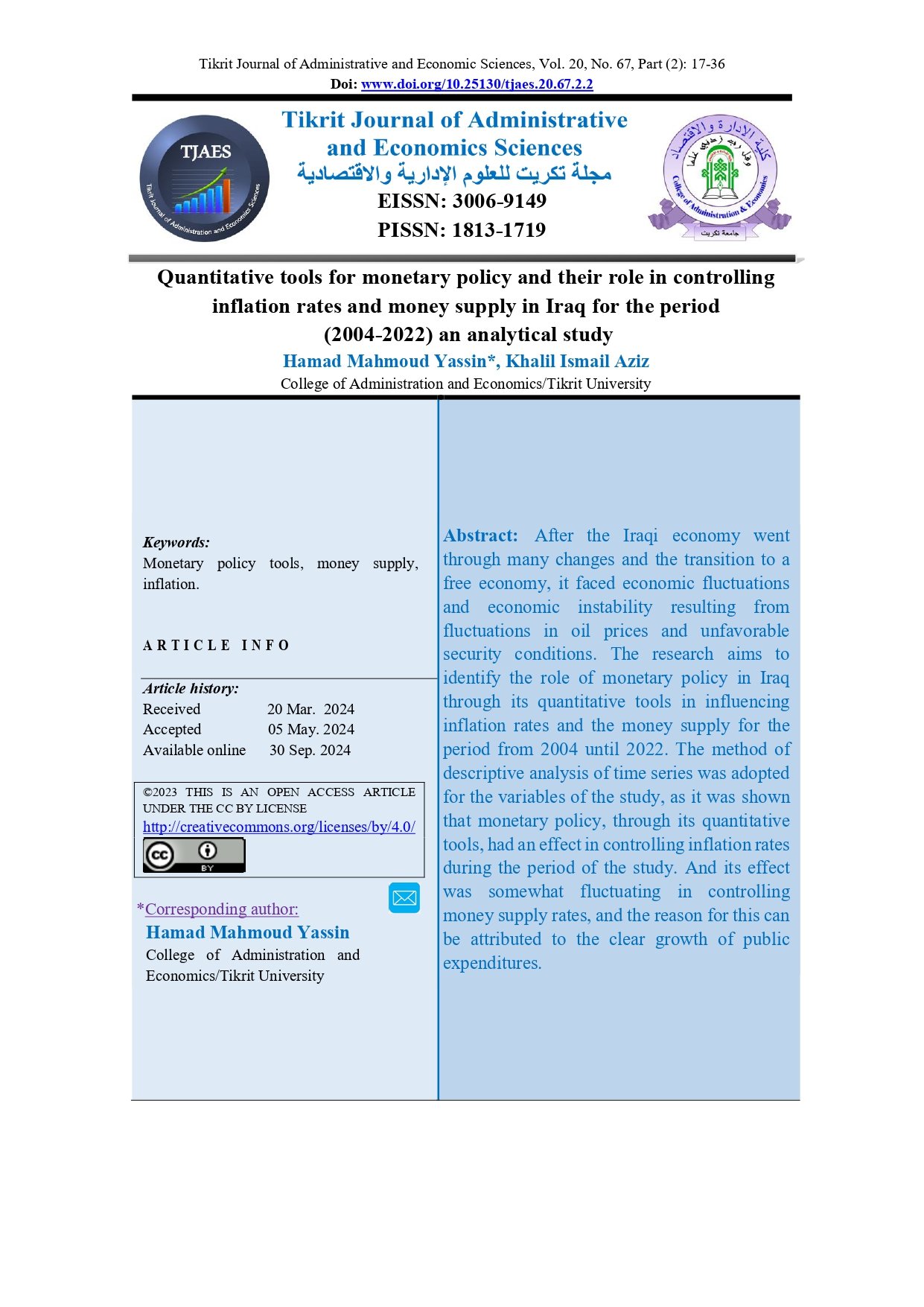 الأدوات الكمية للسياسة النقدية ودورها في ضبط معدلات التضخم وعرض النقد للمدة 2004-2022 دراسة تحليلية