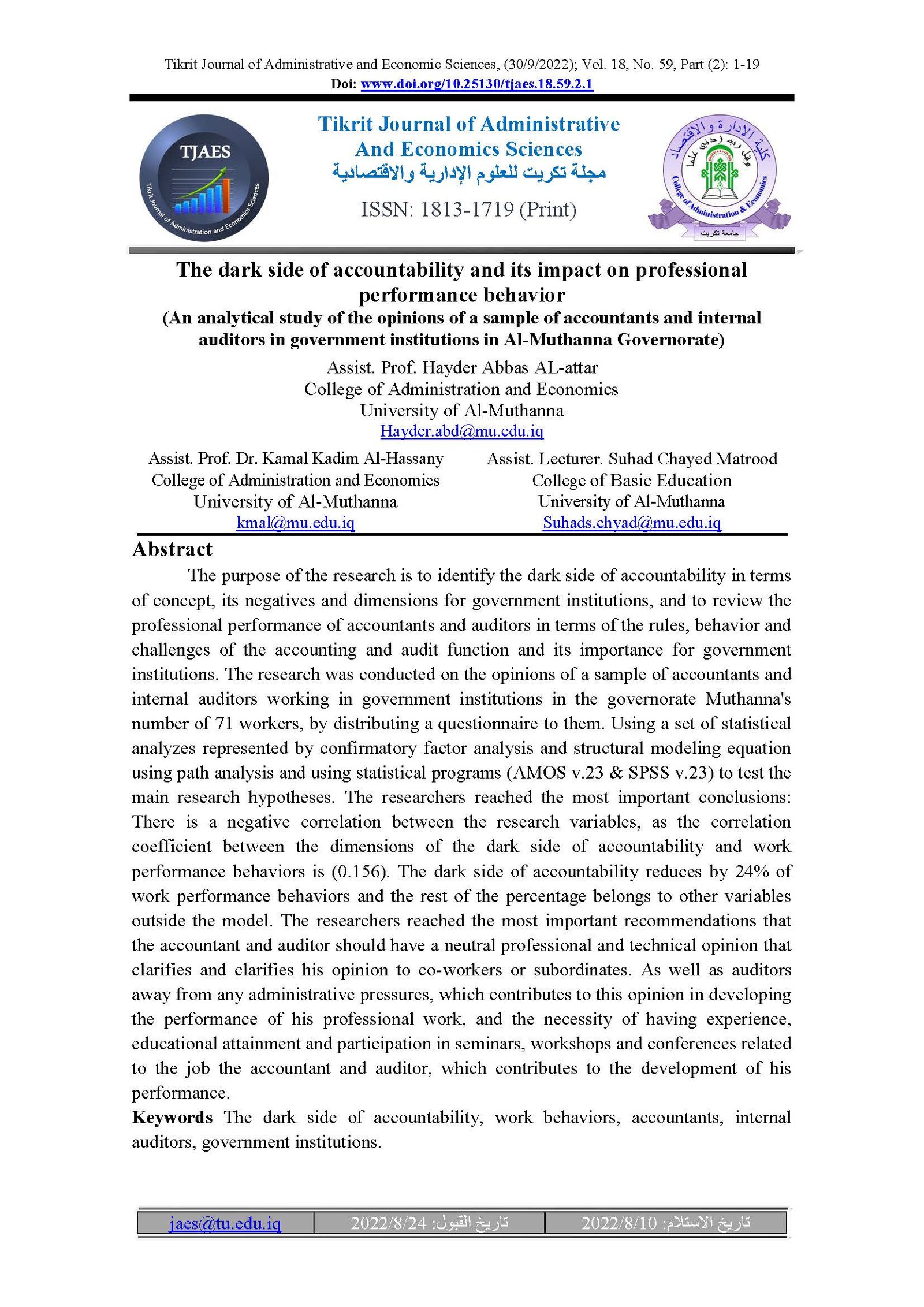 The dark side of accountability and its impact on professional performance behavior (An analytical study of the opinions of a sample of accountants and internal auditors in government institutions in Al-Muthanna Governorate)Abstract views : 42 | PDF downloads : 16Page No.: 1-19 |