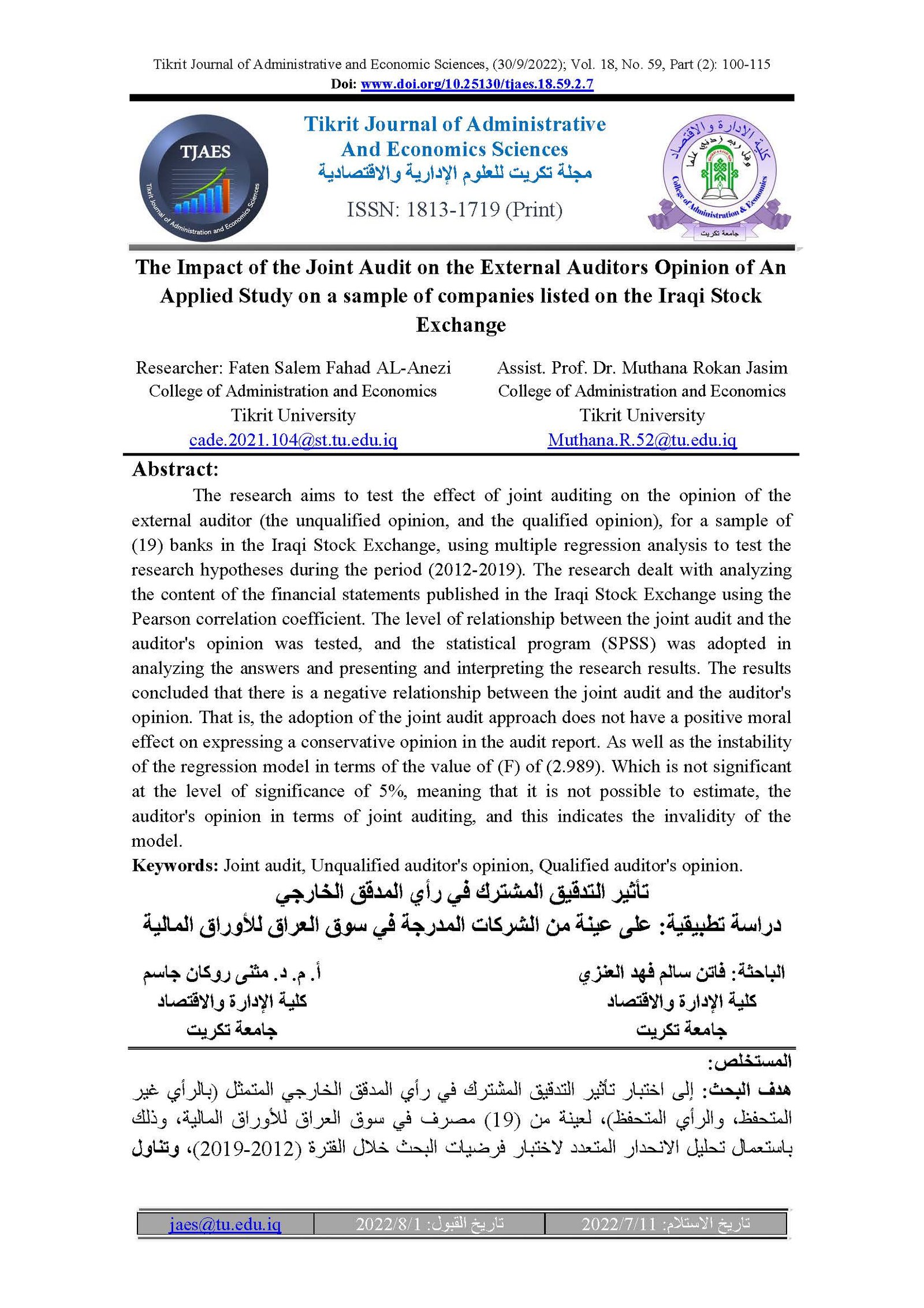 The Impact of the Joint Audit on the External Auditors Opinion of An Applied Study on a sample of companies listed on the Iraqi Stock ExchangeAbstract views : 39 | PDF downloads : 31Page No.: 100-115 |