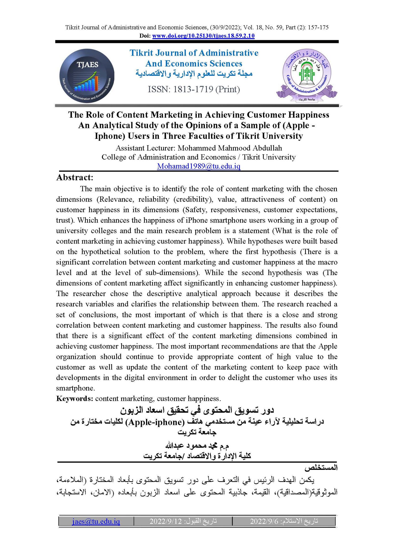 The Role of Content Marketing in Achieving Customer Happiness An Analytical Study of the Opinions of a Sample of (Apple - Iphone) Users in Three Faculties of Tikrit UniversityAbstract views : 119 | PDF downloads : 80Page No.: 157-175 |