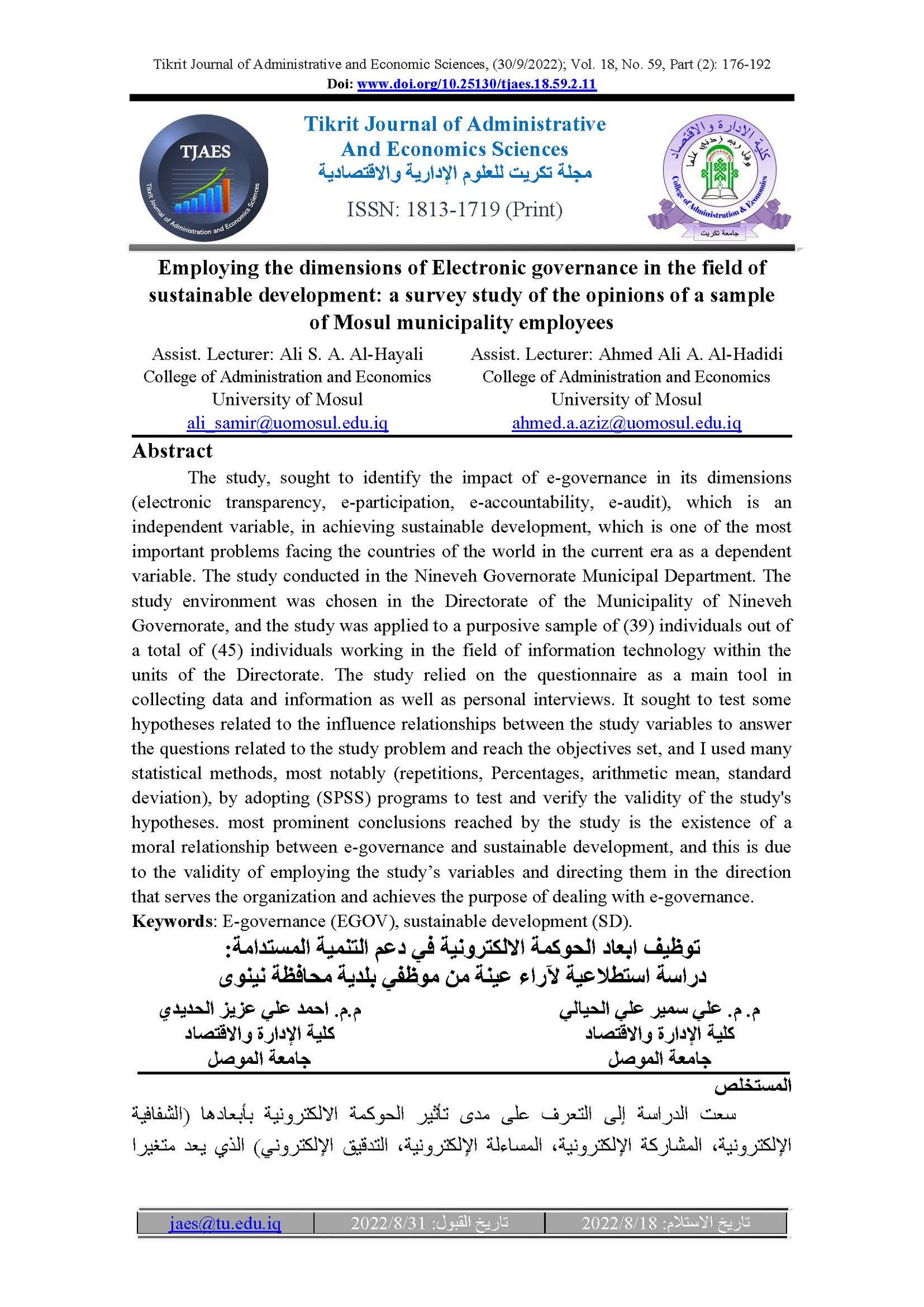Employing the dimensions of Electronic governance in the field of sustainable development: a survey study of the opinions of a sample of Mosul municipality employeesAbstract views : 67 | PDF downloads : 37Page No.: 176-192 |