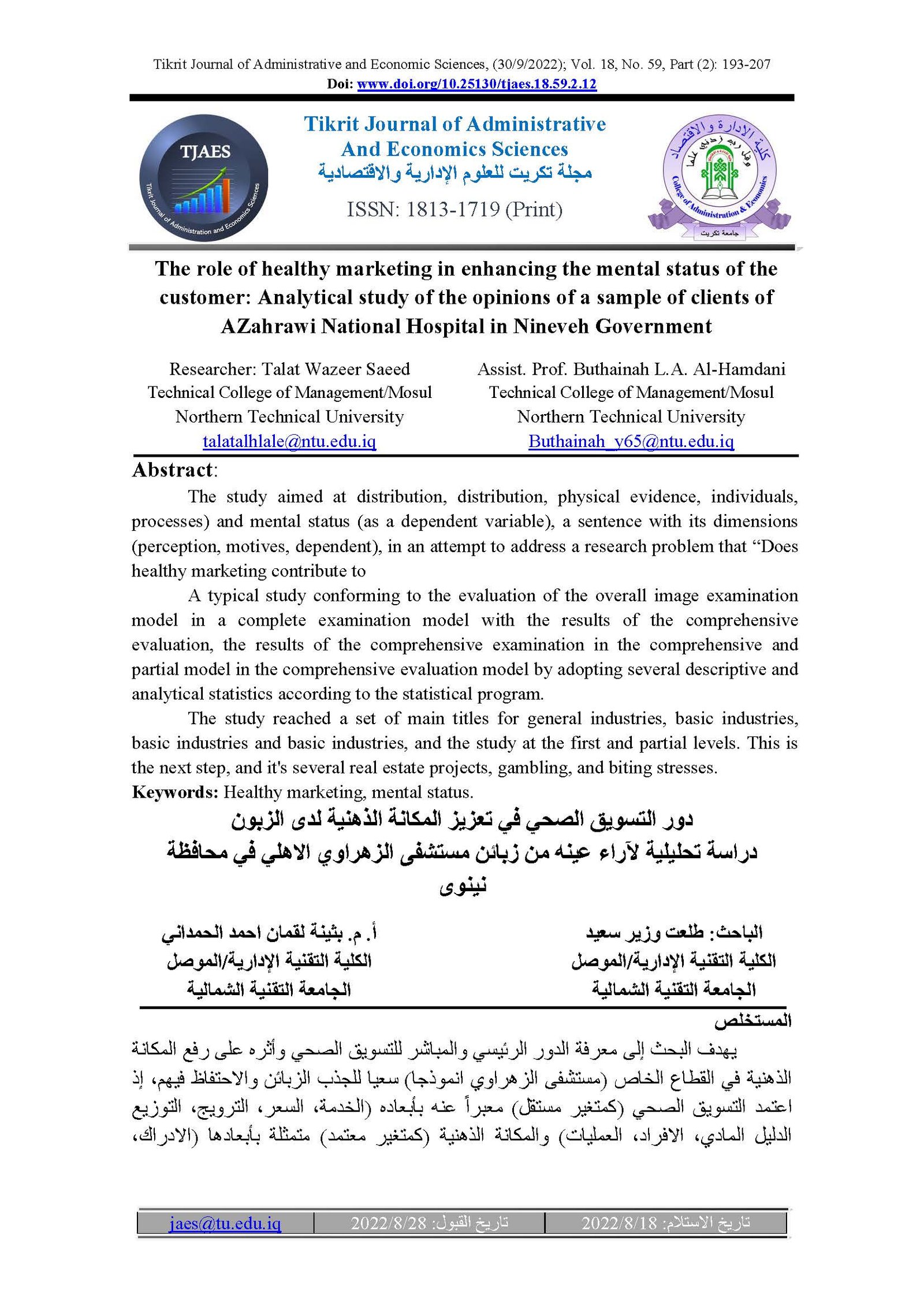 The role of healthy marketing in enhancing the mental status of the customer: Analytical study of the opinions of a sample of clients of AZahrawi National Hospital in Nineveh GovernmentAbstract views : 23 | PDF downloads : 13Page No.: 193-207 |
