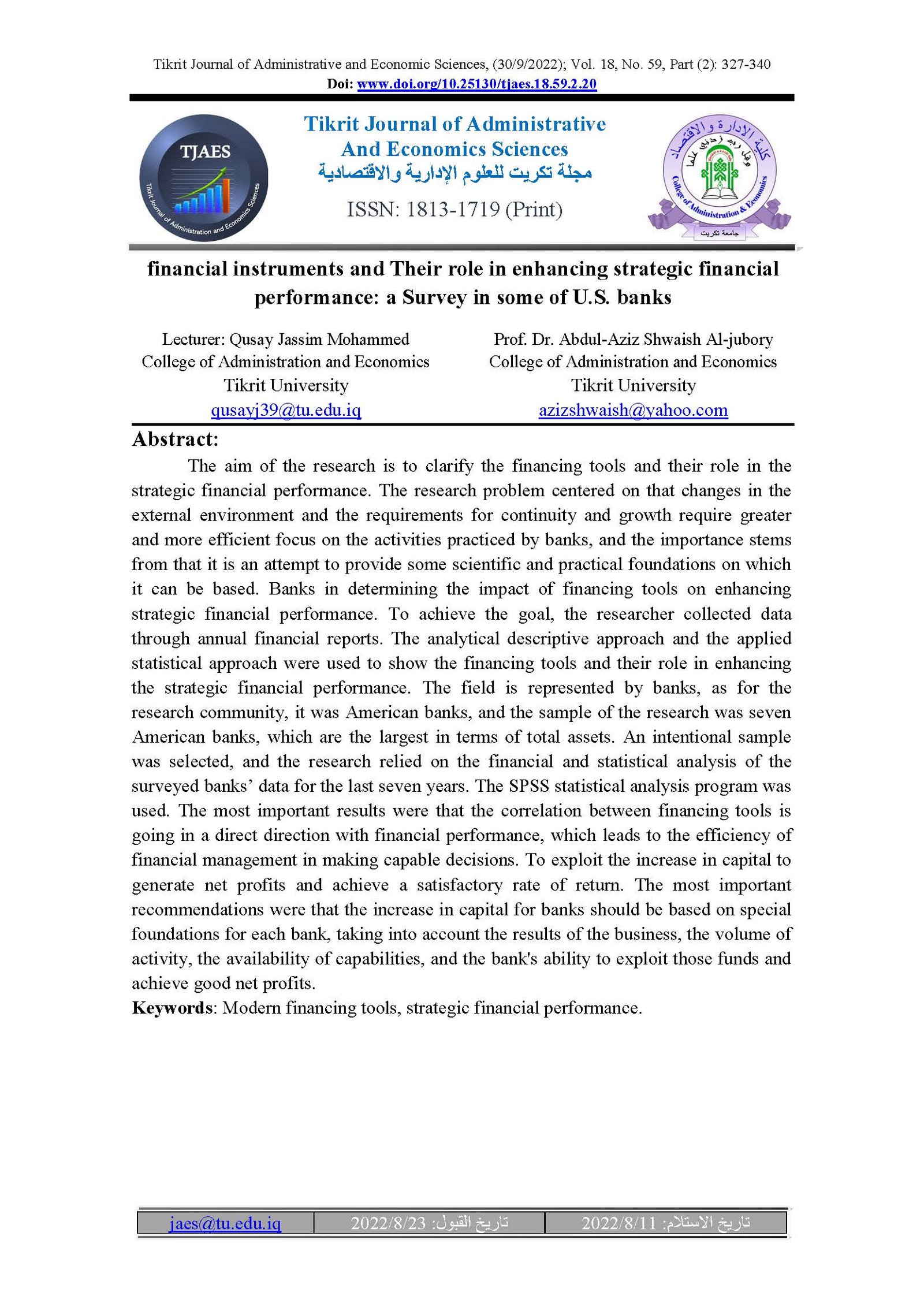 financial instruments and Their role in enhancing strategic financial performance: a Survey in some of U.S. banksAbstract views : 31 | PDF downloads : 21Page No.: 327-340 |