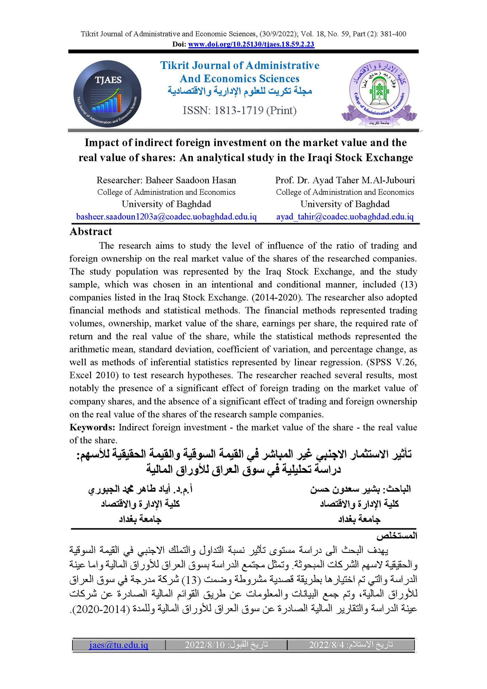 Impact of indirect foreign investment on the market value and the real value of shares: An analytical study in the Iraqi Stock ExchangeAbstract views : 54 | PDF downloads : 34Page No.: 381-400 |