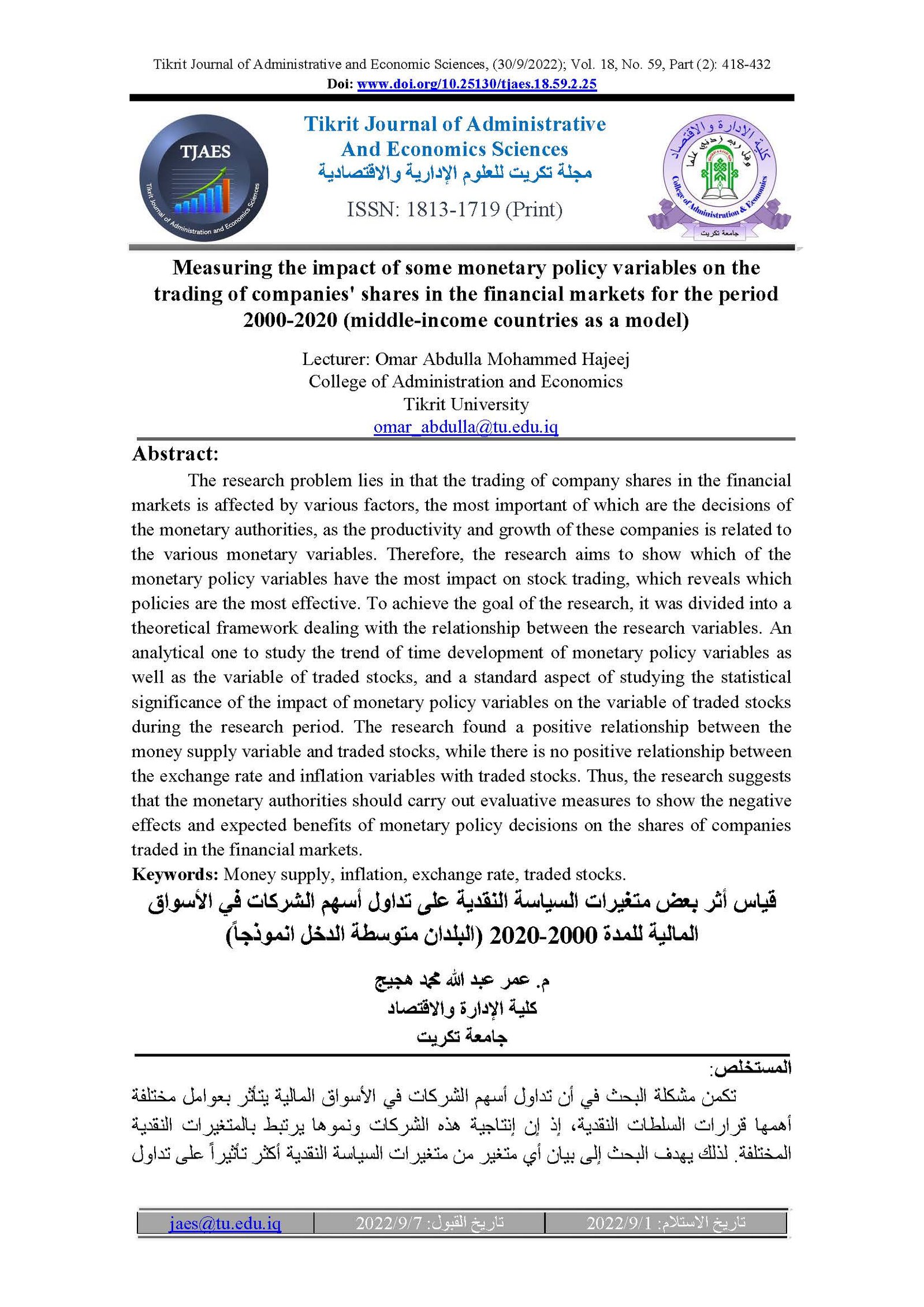 Measuring the impact of some monetary policy variables on the trading of companies' shares in the financial markets for the period 2000-2020 (middle-income countries as a model)Abstract views : 27 | PDF downloads : 20Page No.: 418-432 |