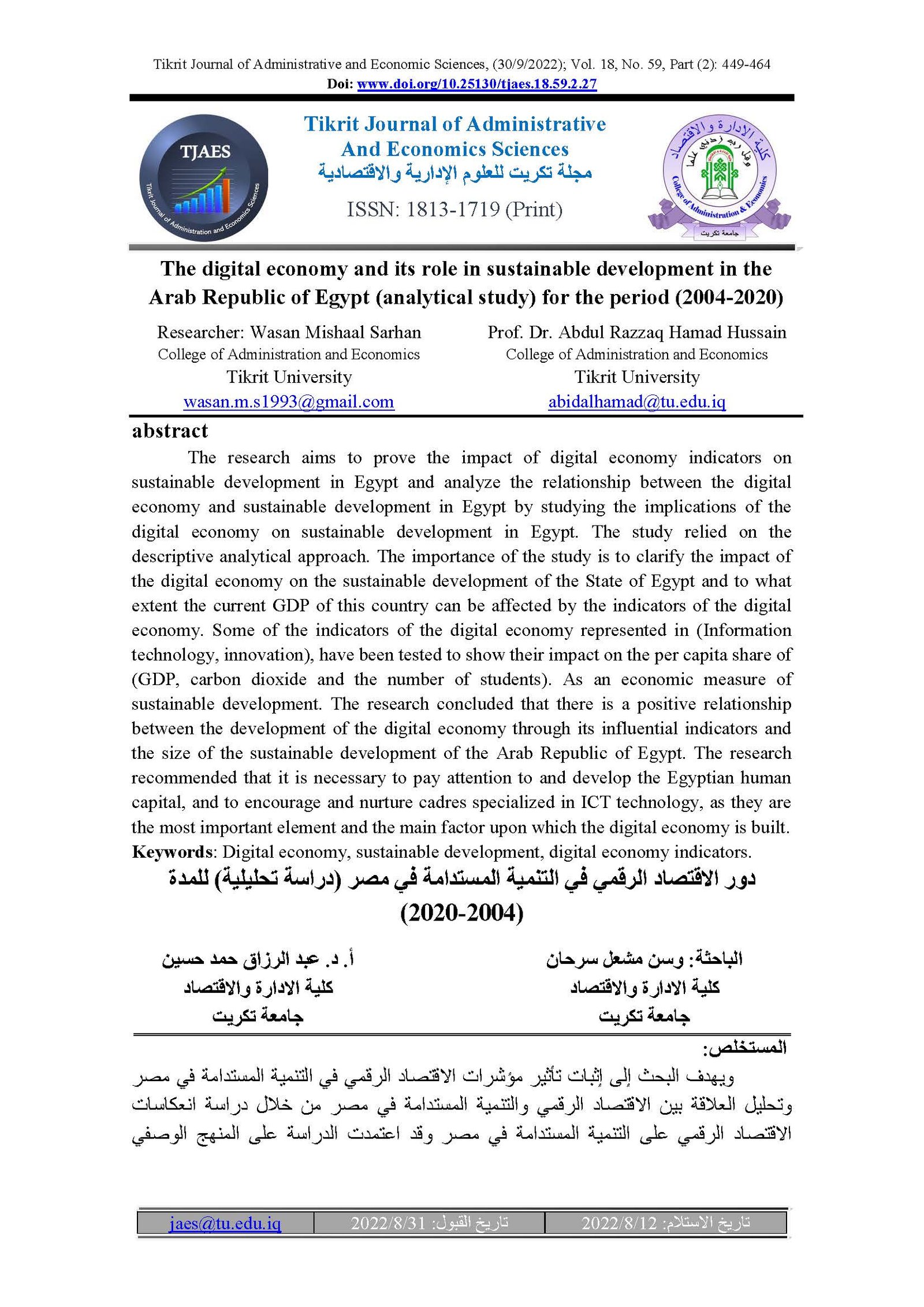 The digital economy and its role in sustainable development in the Arab Republic of Egypt (analytical study) for the period (2004-2020)Abstract views : 52 | PDF downloads : 35Page No.: 449-464 |