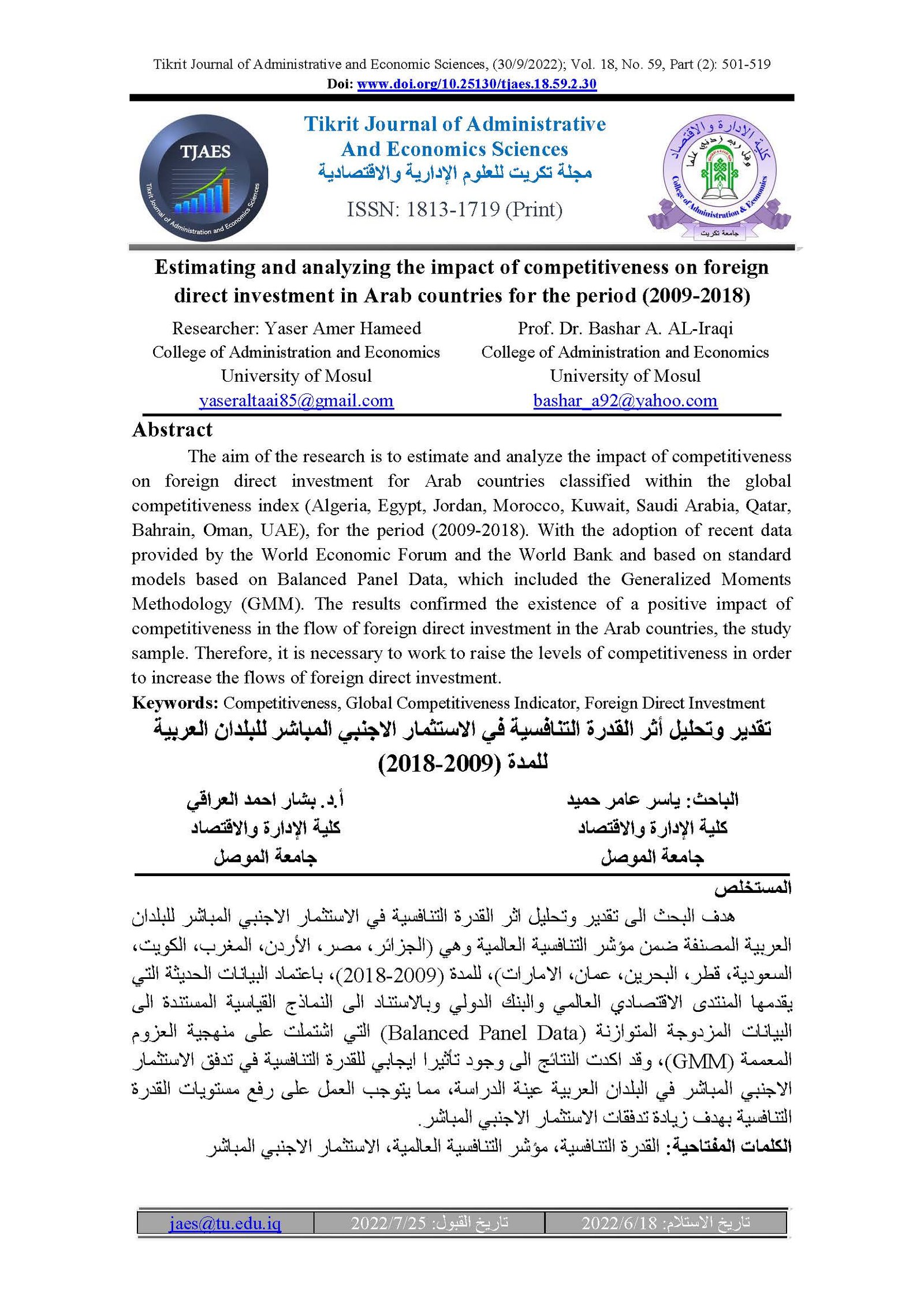 Estimating and analyzing the impact of competitiveness on foreign direct investment in Arab countries for the period (2009-2018)Abstract views : 37 | PDF downloads : 27Page No.: 501-519 |
