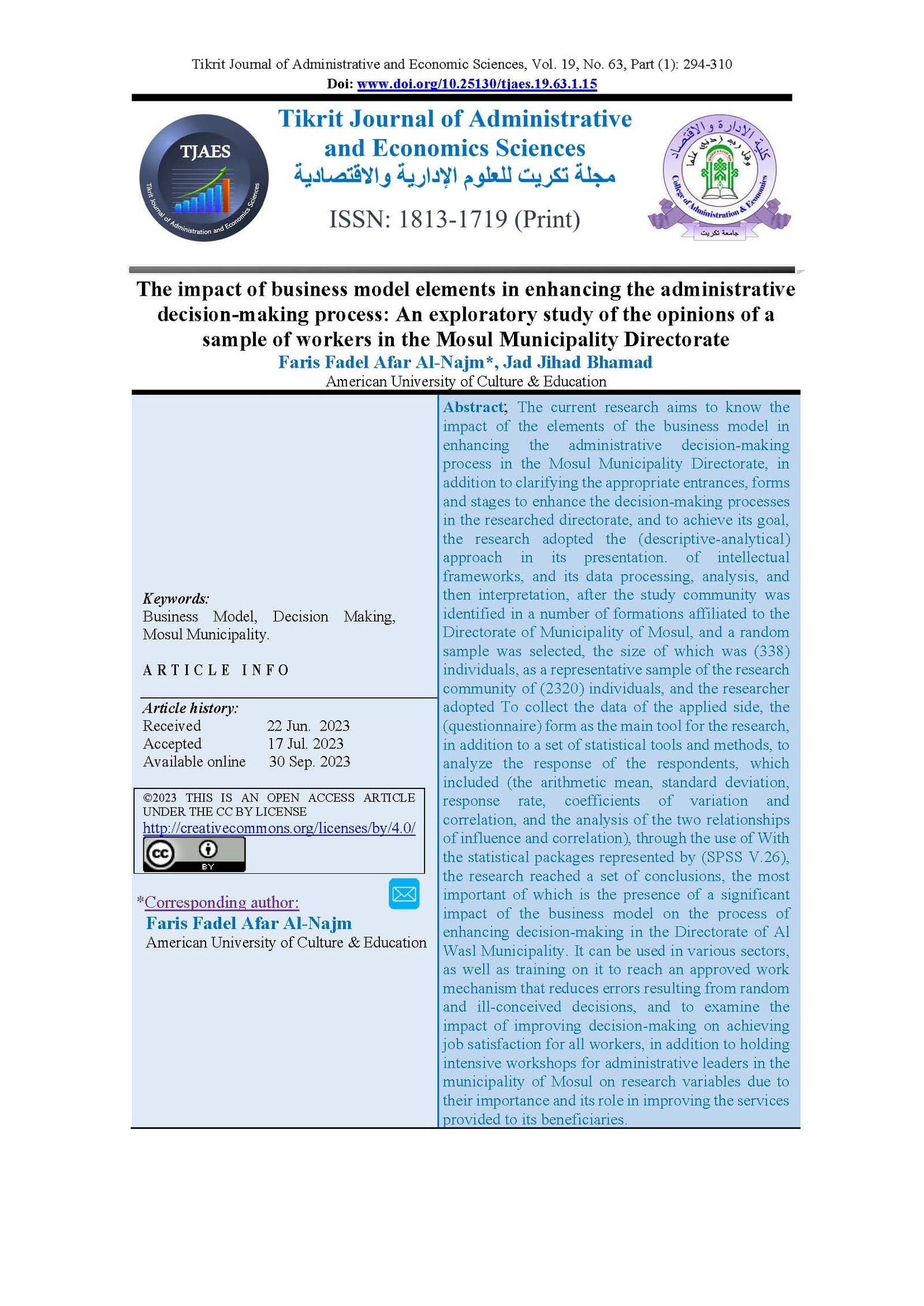 The impact of business model elements in enhancing the administrative decision-making process: An exploratory study of the opinions of a sample of workers in the Mosul Municipality DirectorateAbstract views : 1 | PDF downloads : 0Page No.: 294-310 |