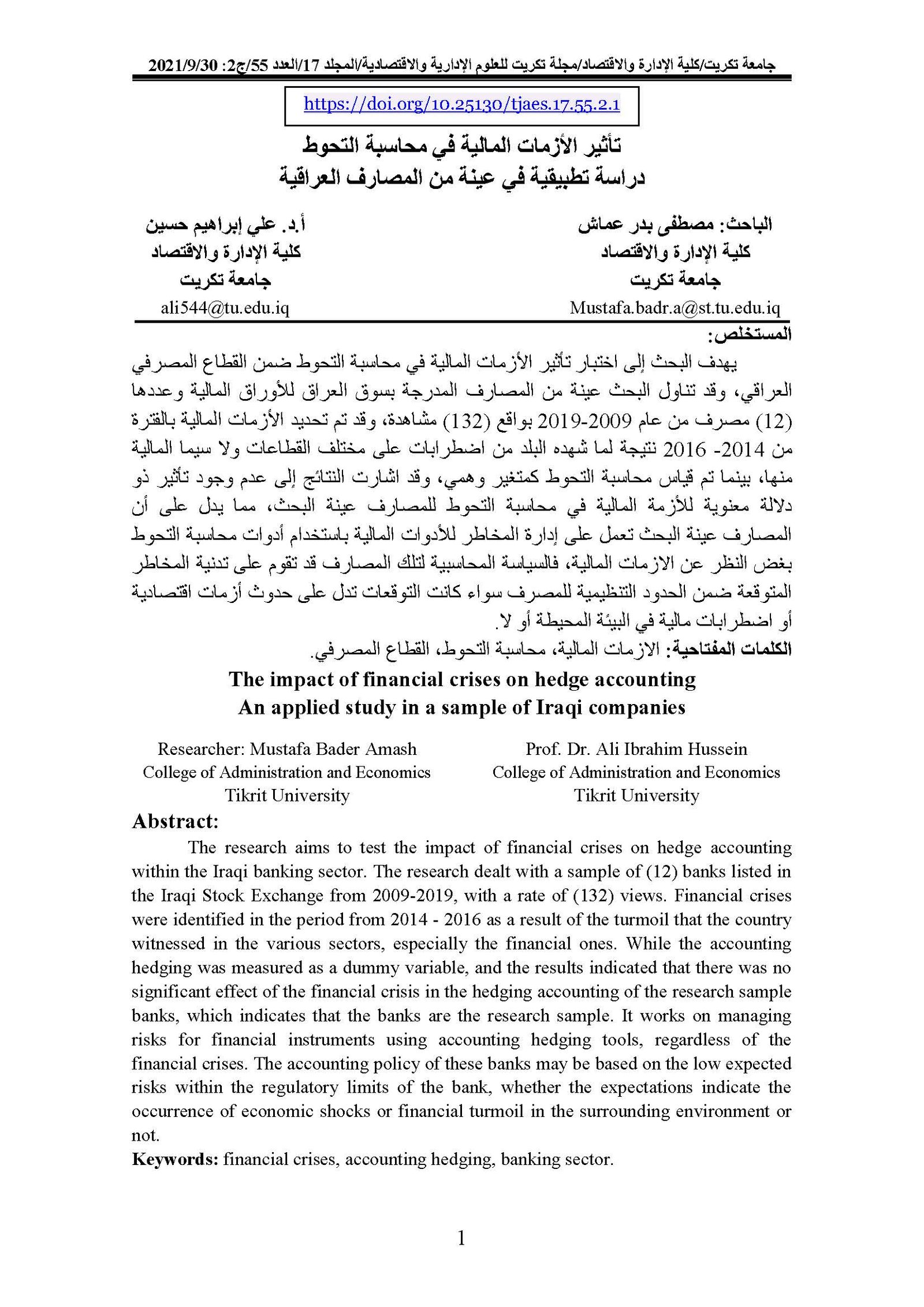 The impact of financial crises on hedge accounting An applied study in a sample of Iraqi companiesAbstract views : 0 | PDF downloads : 0Page No.: 1-19 |