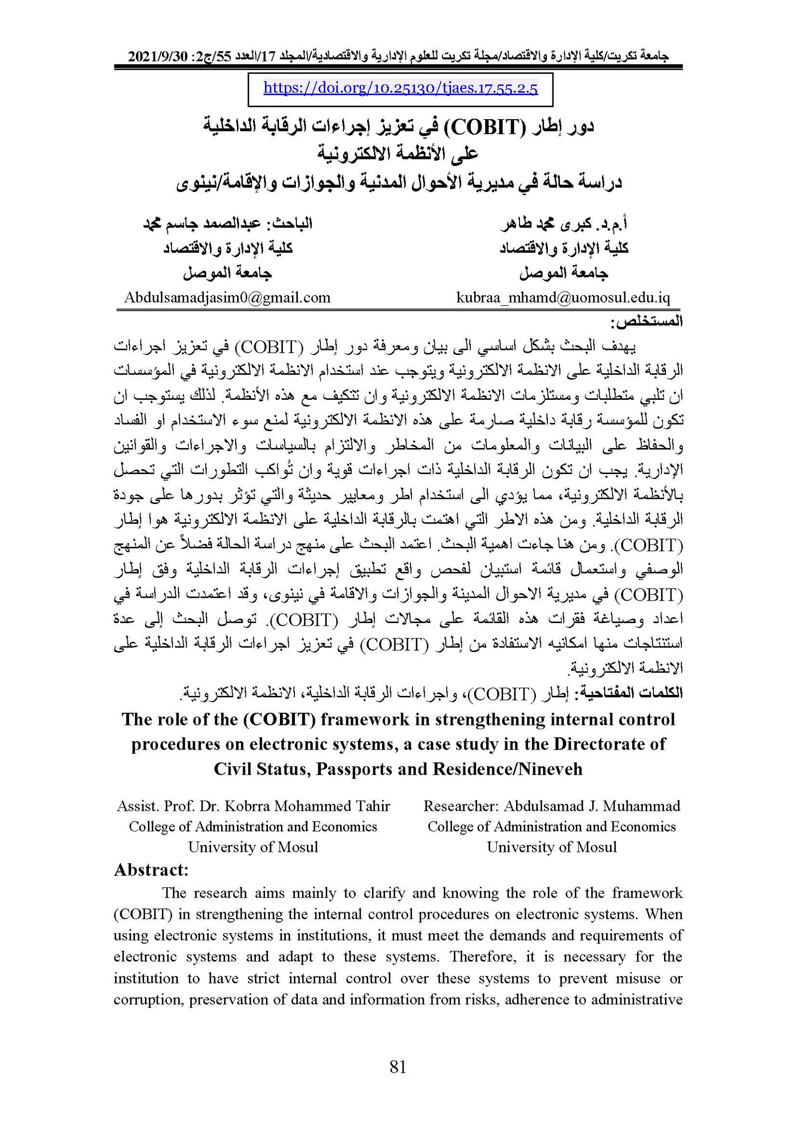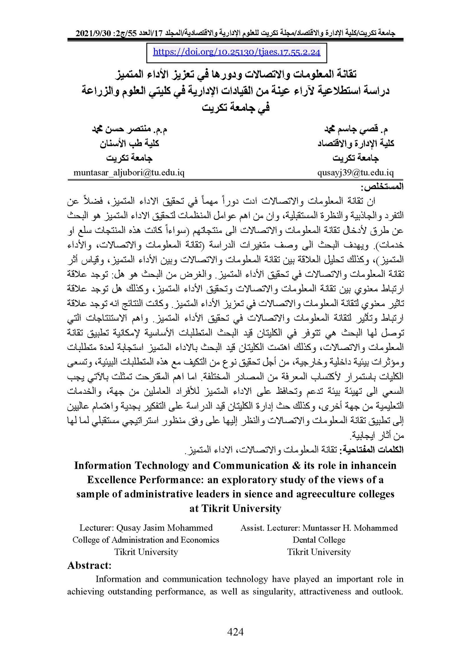 Information Technology and Communication & its role in inhancein Excellence Performance: an exploratory study of the views of a sample of administrative leaders in sience and agreeculture colleges at Tikrit UniversityAbstract views : 0 | PDF downloads : 0Page No.: 424-444 |