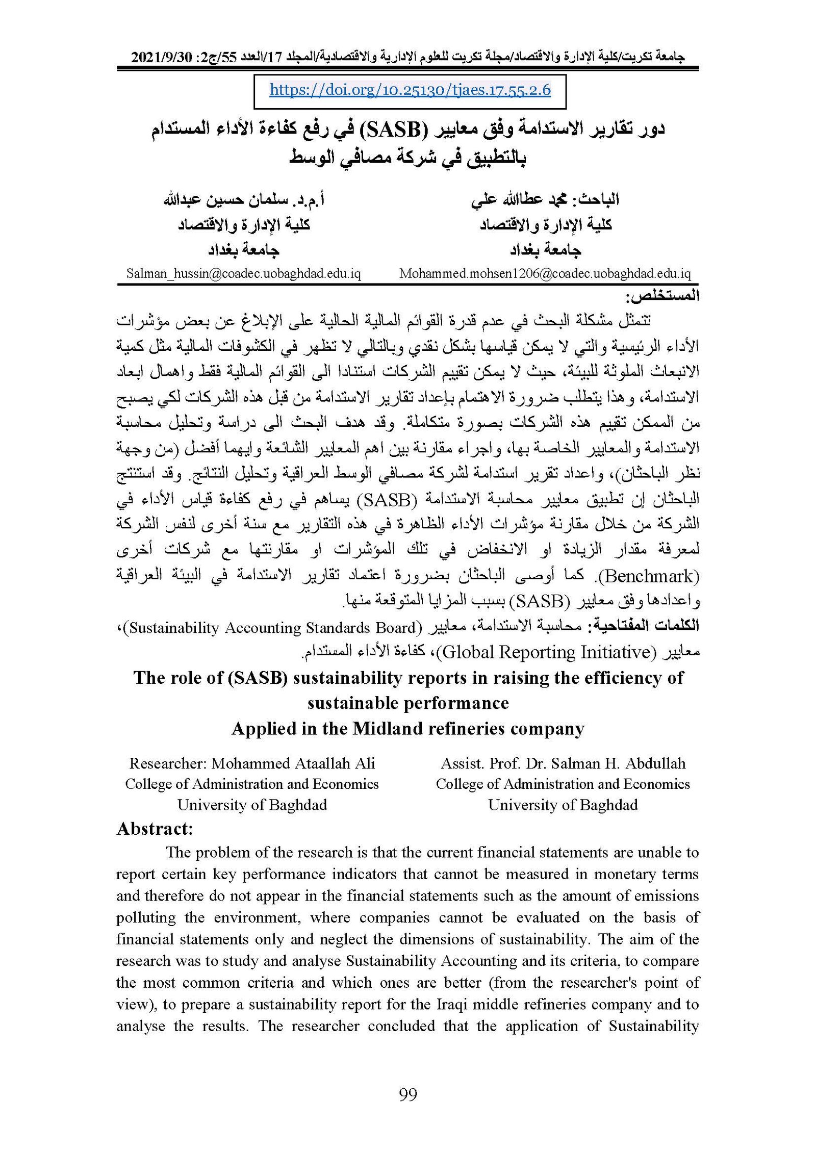 The role of (SASB) sustainability reports in raising the efficiency of sustainable performance Applied in the Midland refineries companyAbstract views : 0 | PDF downloads : 0Page No.: 99-111 |