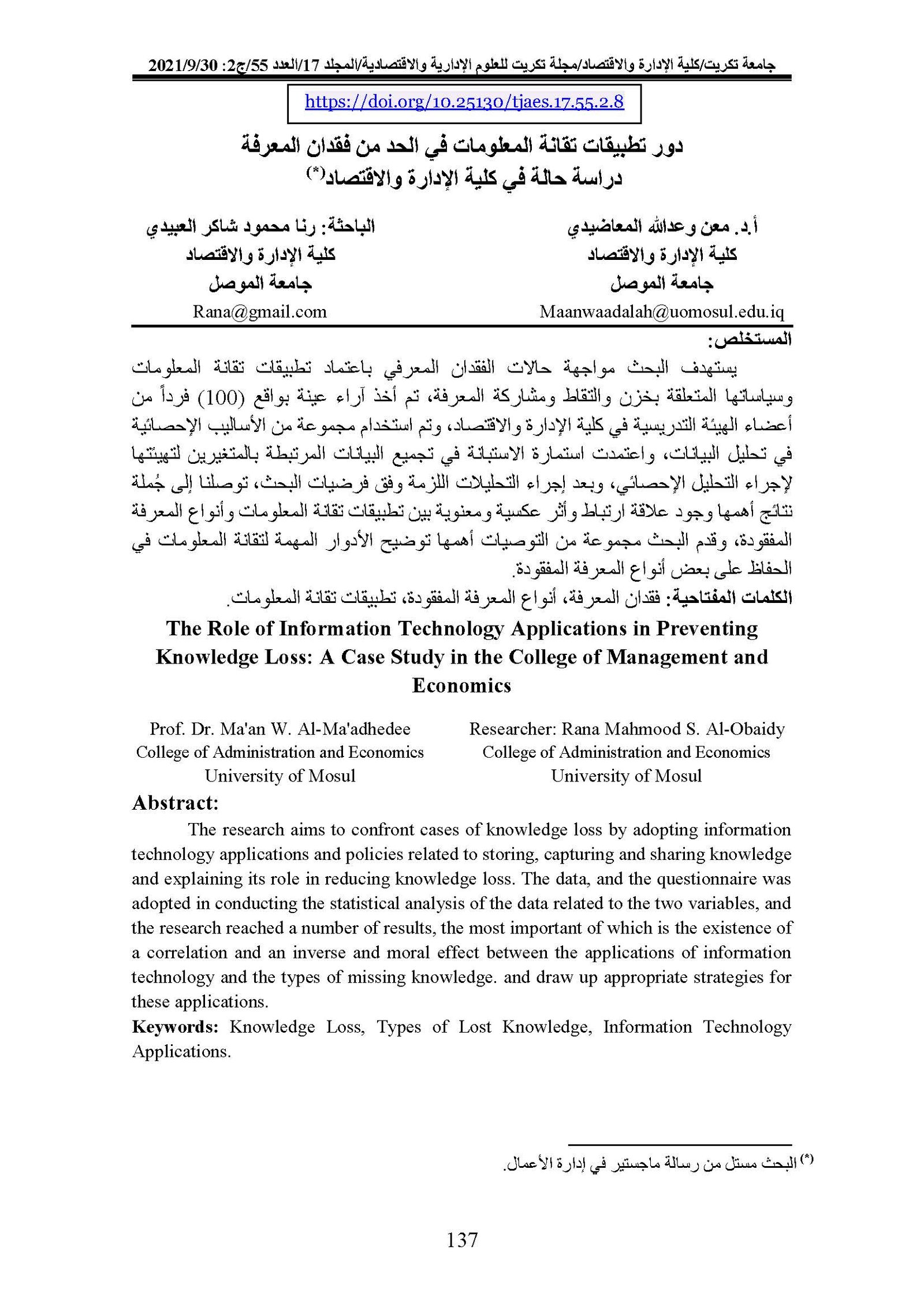 The Role of Information Technology Applications in Preventing Knowledge Loss: A Case Study in the College of Management and EconomicsAbstract views : 0 | PDF downloads : 0Page No.: 137-152 |