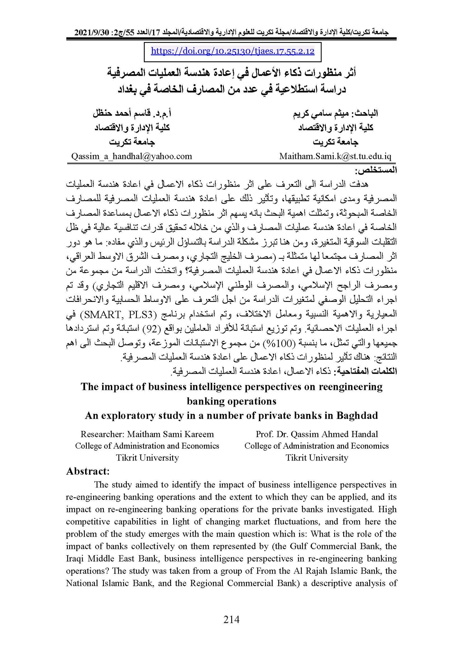 The impact of business intelligence perspectives on reengineering banking operations An exploratory study in a number of private banks in BaghdadAbstract views : 0 | PDF downloads : 0Page No.: 214-229 |