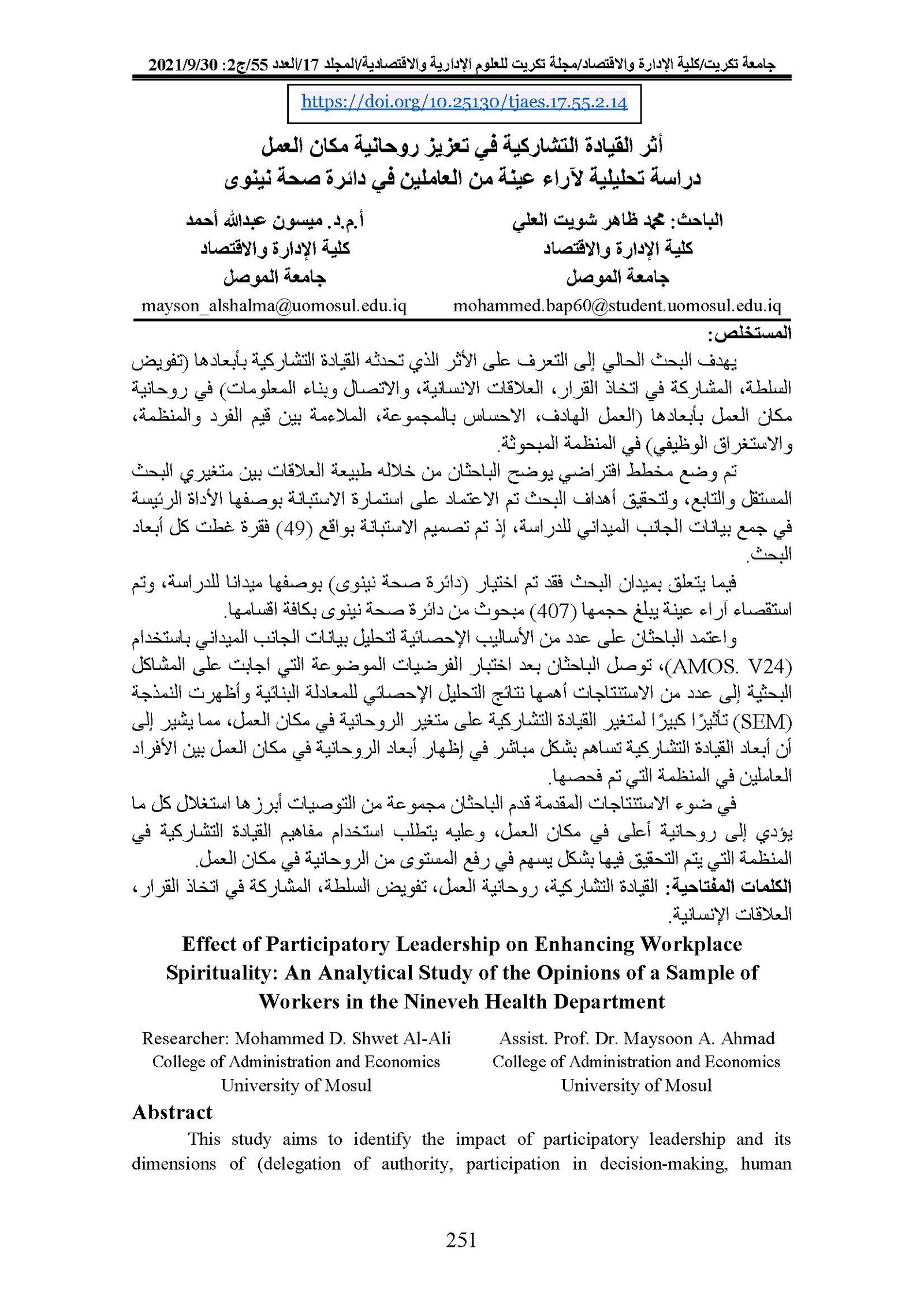 Effect of Participatory Leadership on Enhancing Workplace Spirituality: An Analytical Study of the Opinions of a Sample of Workers in the Nineveh Health DepartmentAbstract views : 0 | PDF downloads : 0Page No.: 251-268 |