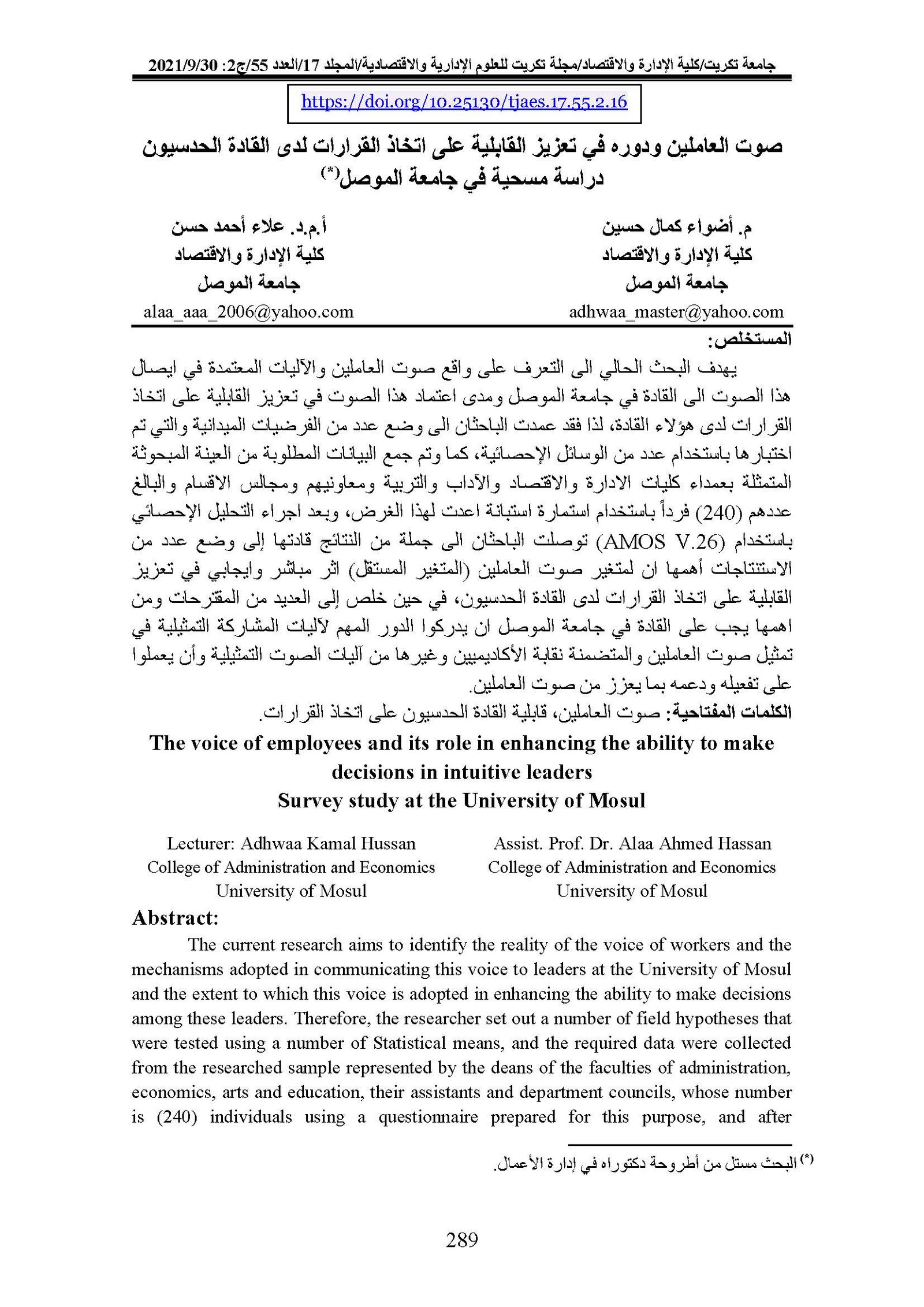 The voice of employees and its role in enhancing the ability to make decisions in intuitive leaders Survey study at the University of MosulAbstract views : 0 | PDF downloads : 0Page No.: 289-303 |