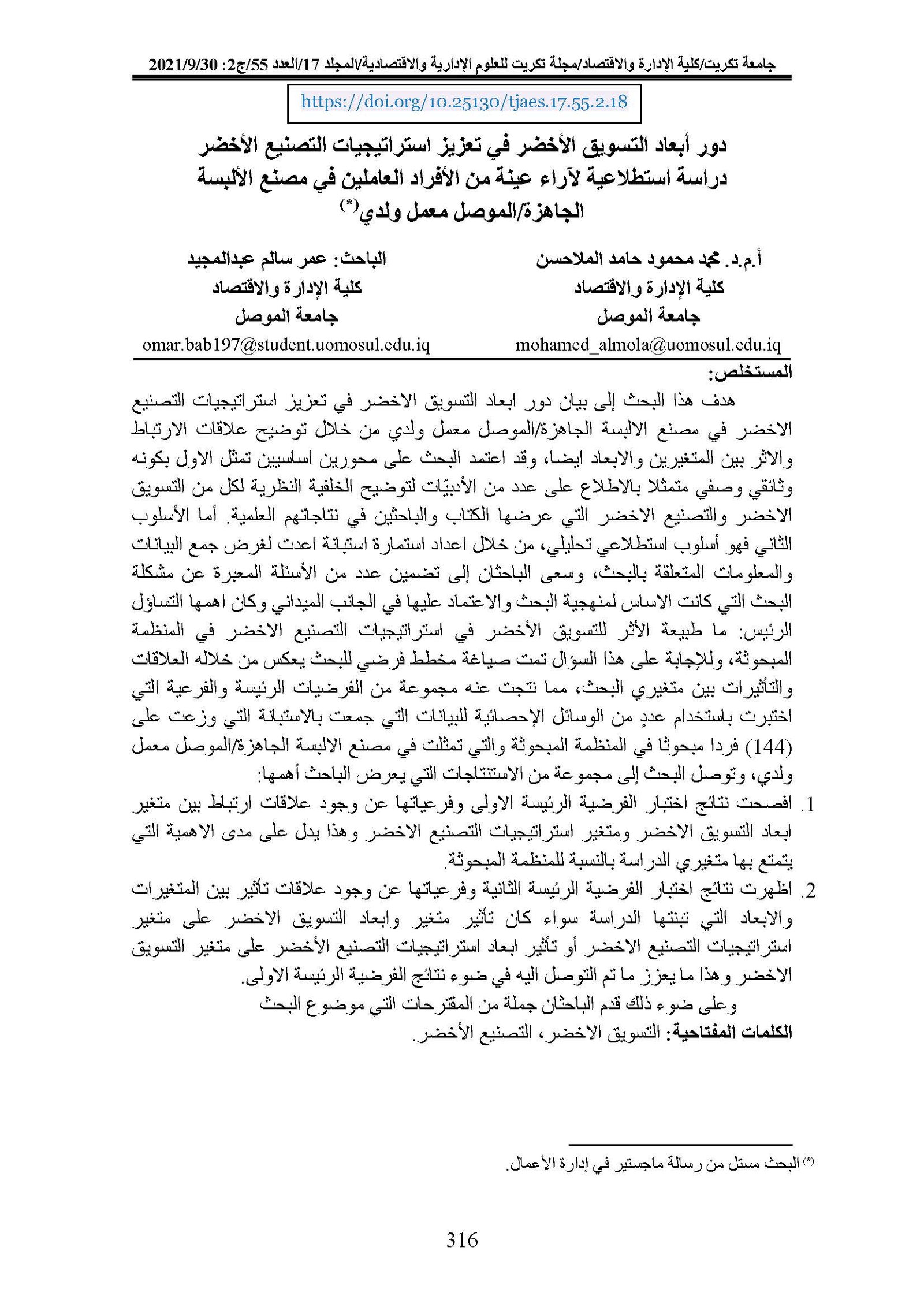 The Role of Green Marketing Dimensions in Promoting Green Manufacturing Strategies An Exploratory Study of the Opinions of a Sample of Individuals Working in Ready-to-Wear Factory/Mosul is a Lab and I have a FactoryAbstract views : 0 | PDF downloads : 0Page No.: 316-335 |
