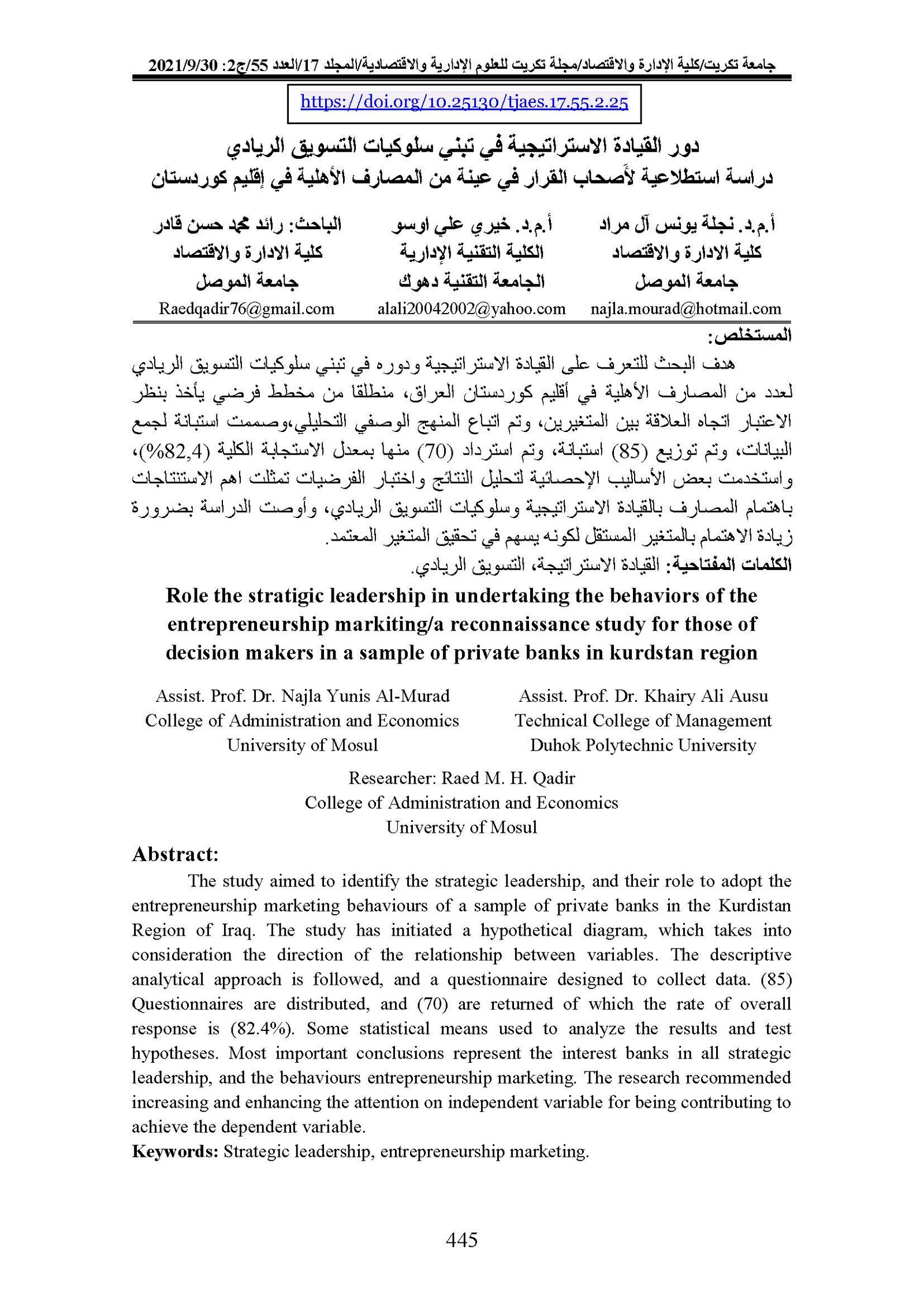 Role the stratigic leadership in undertaking the behaviors of the entrepreneurship markiting/a reconnaissance study for those of decision makers in a sample of private banks in kurdstan regionAbstract views : 0 | PDF downloads : 0Page No.: 445-461 |