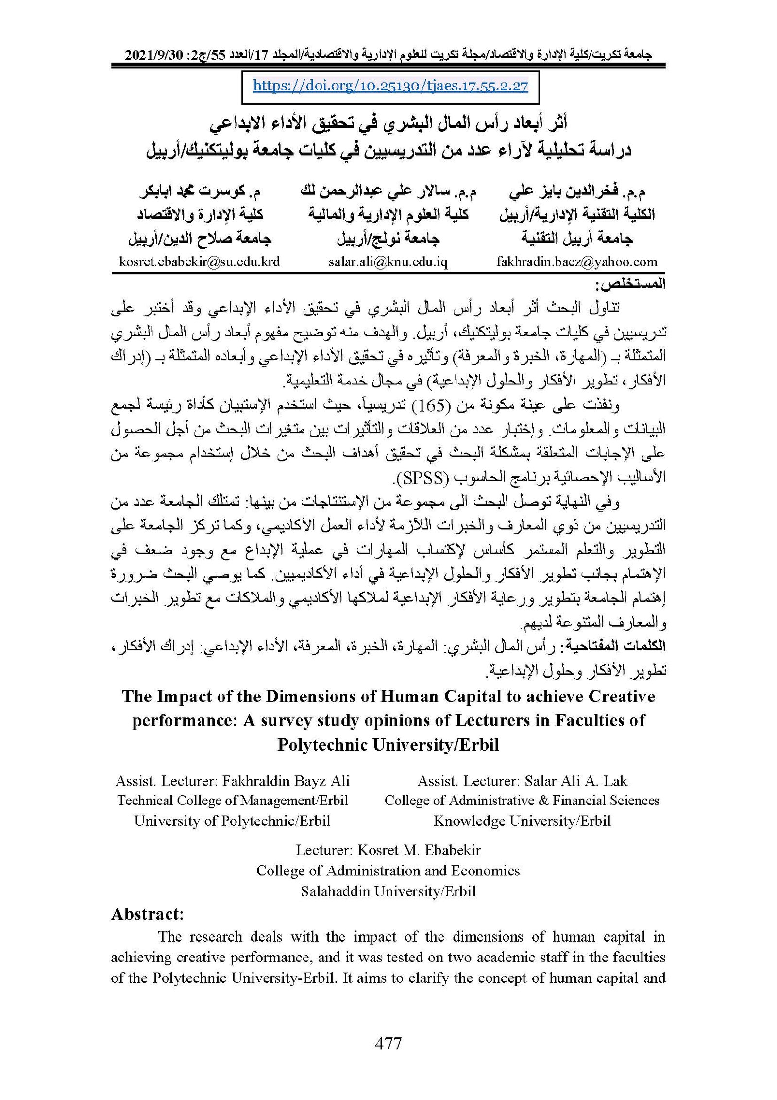 The Impact of the Dimensions of Human Capital to achieve Creative performance: A survey study opinions of Lecturers in Faculties of Polytechnic University/ErbilAbstract views : 0 | PDF downloads : 0Page No.: 477-492 |
