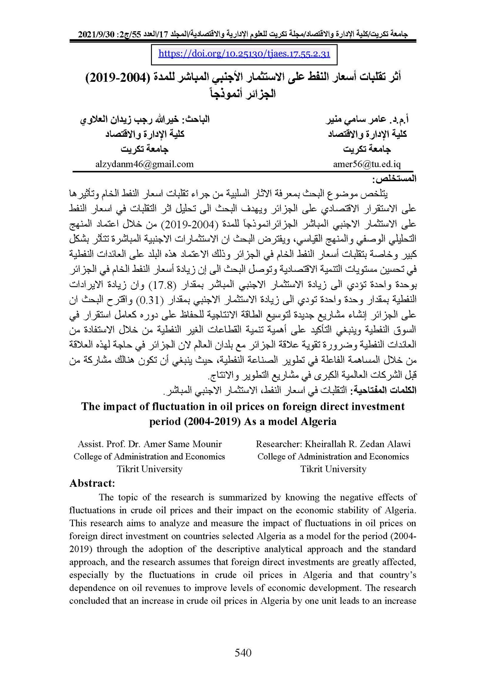 The impact of fluctuation in oil prices on foreign direct investment period (2004-2019) As a model AlgeriaAbstract views : 0 | PDF downloads : 0Page No.: 540-554 |