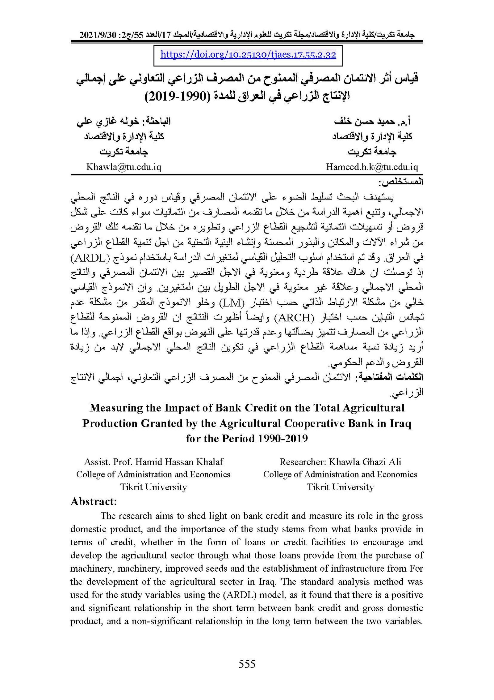Measuring the Impact of Bank Credit on the Total Agricultural Production Granted by the Agricultural Cooperative Bank in Iraq for the Period 1990-2019Abstract views : 0 | PDF downloads : 0Page No.: 555-569 |