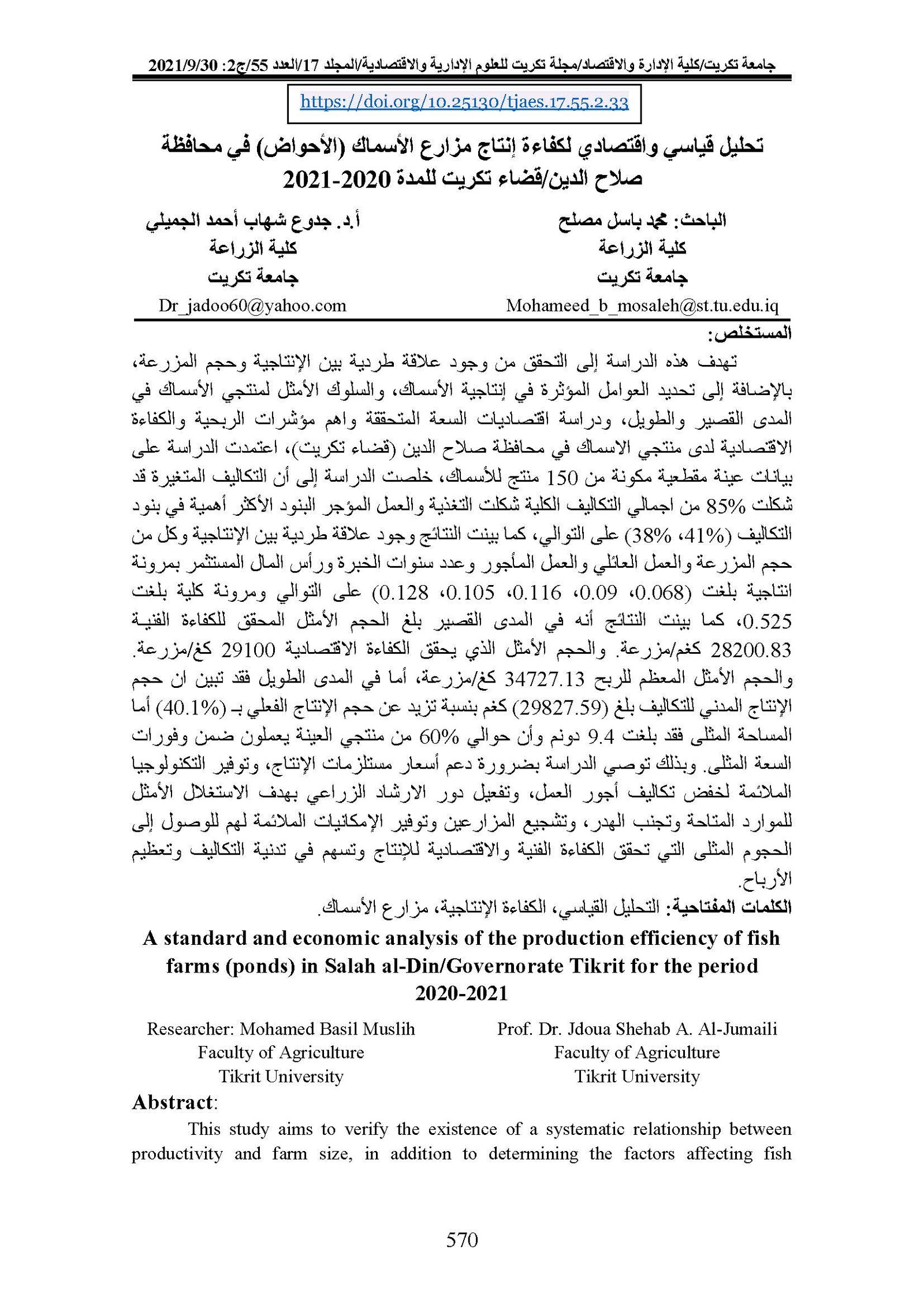 A standard and economic analysis of the production efficiency of fish farms (ponds) in Salah al-Din/Governorate Tikrit for the period 2020-2021Abstract views : 0 | PDF downloads : 0Page No.: 570-579 |